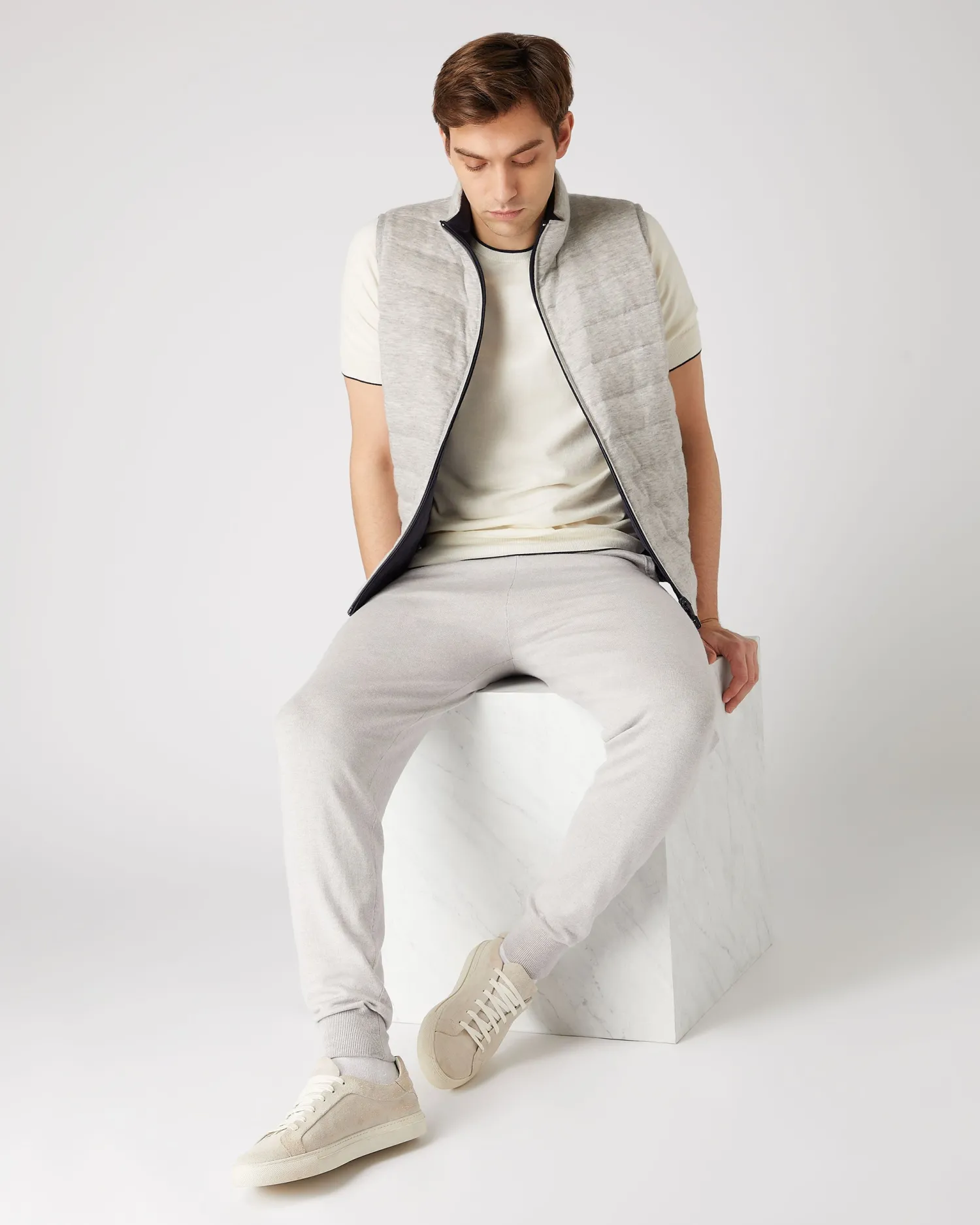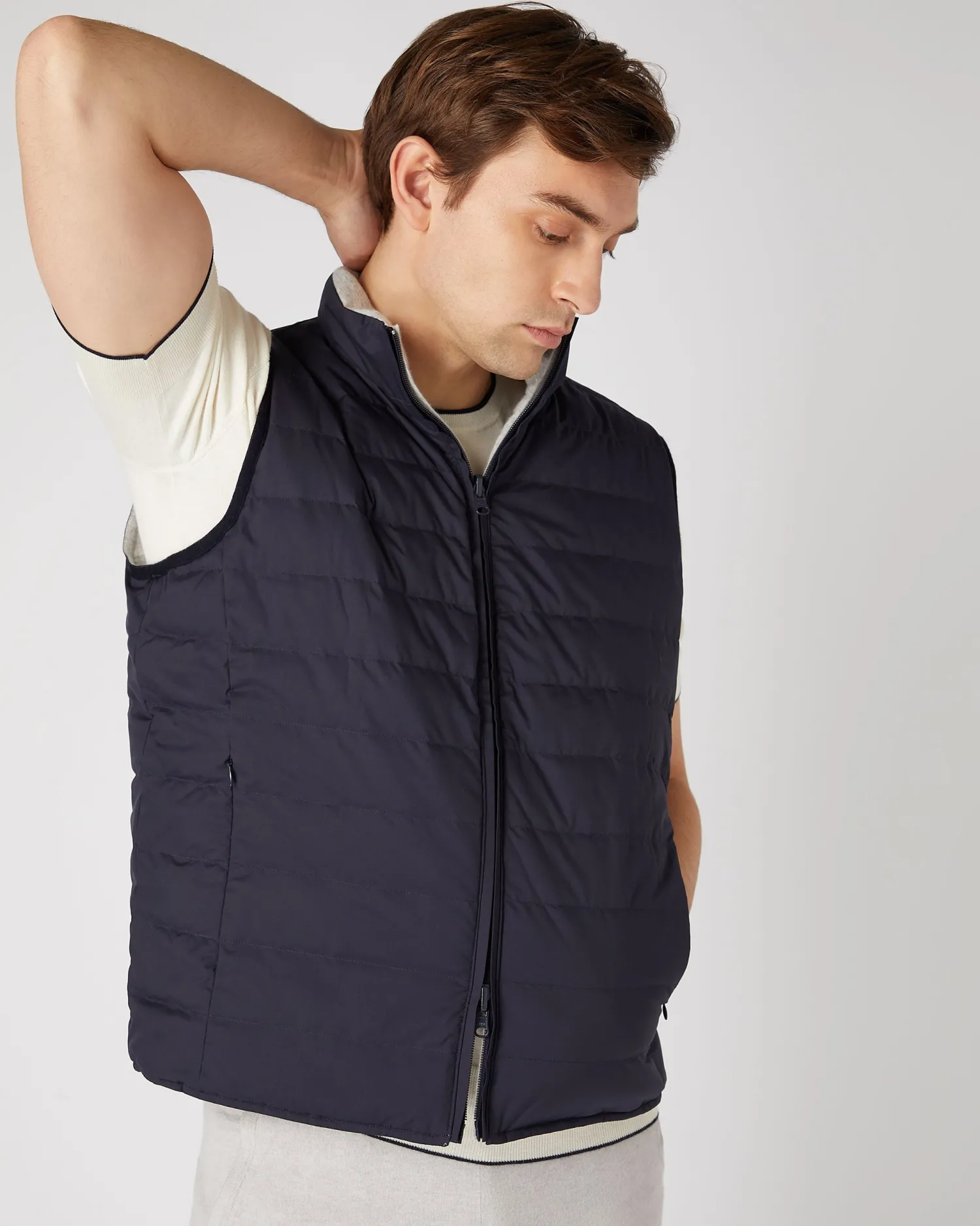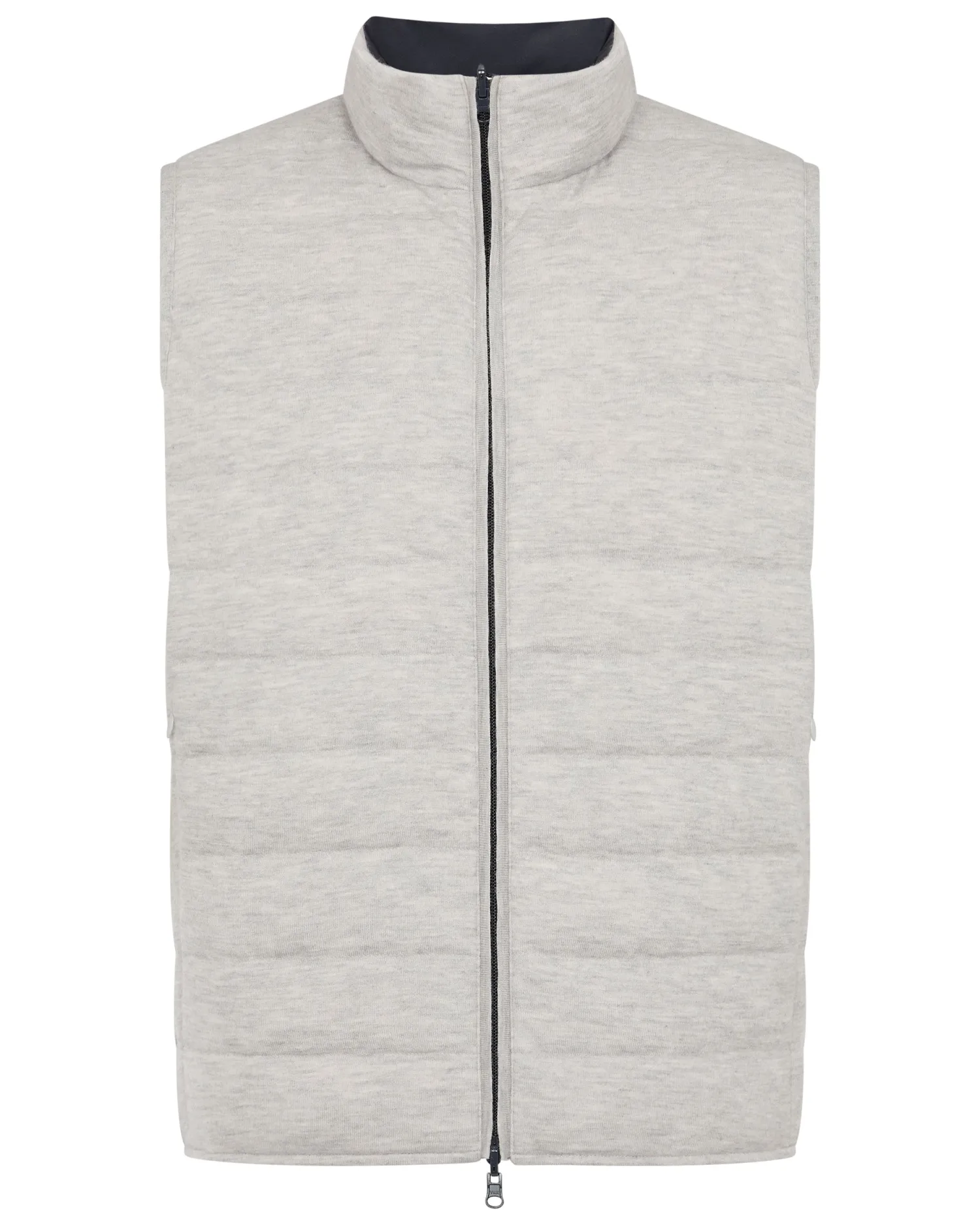 A whole new gilet style, reversible and padded with down. Carefully designed with a London Weather System™ outer finish which offers the finest comfort whilst providing water repellence and wind resistance. Made from 100% organic cashmere teamed with a gentle nylon – Two way zip – Horizontal stitch pattern – Side pockets – Fumo grey with navy blue reverse – Reversible style for ultimate versatility – 1ply – Model is wearing size Medium – Care: Dry Clean Only