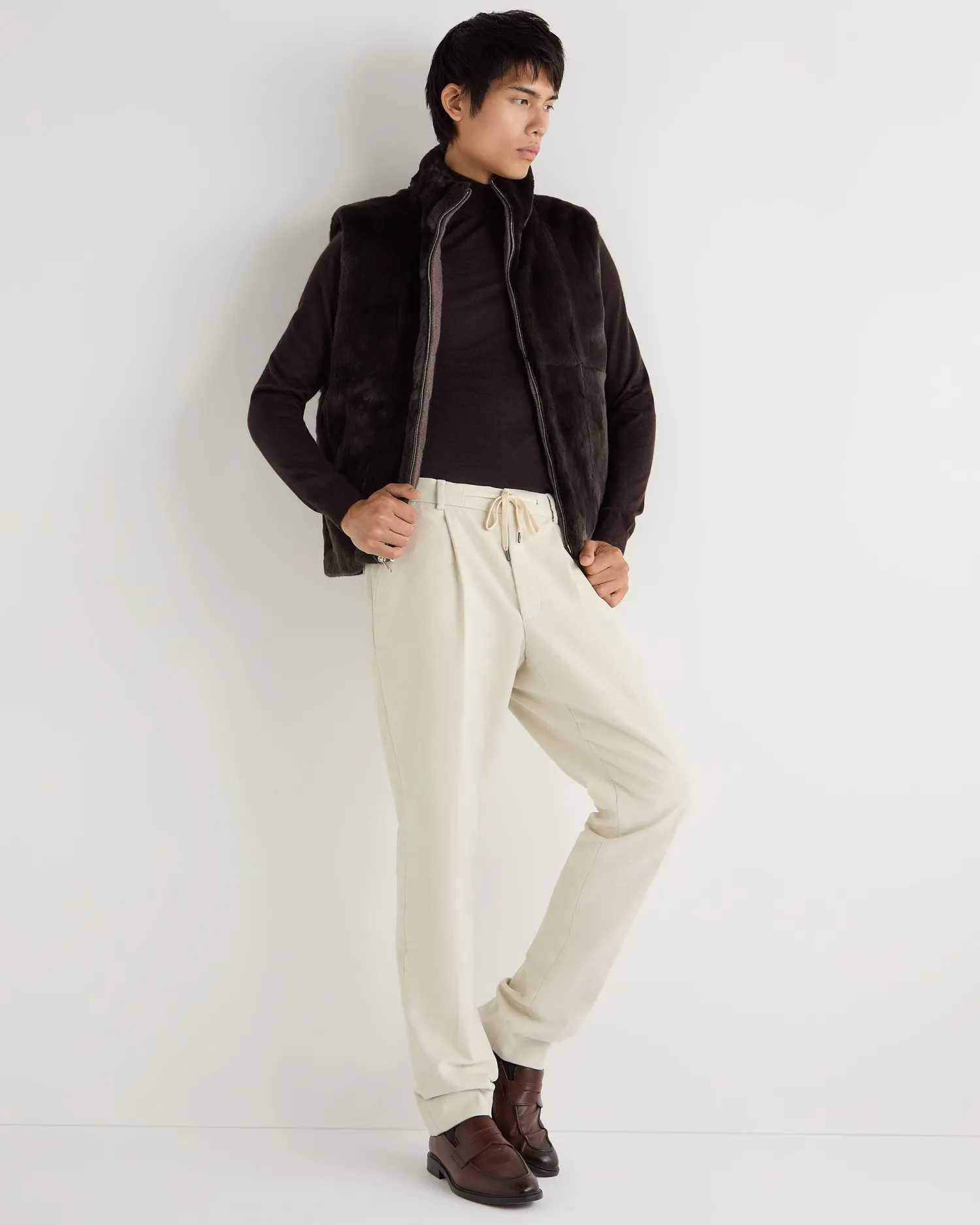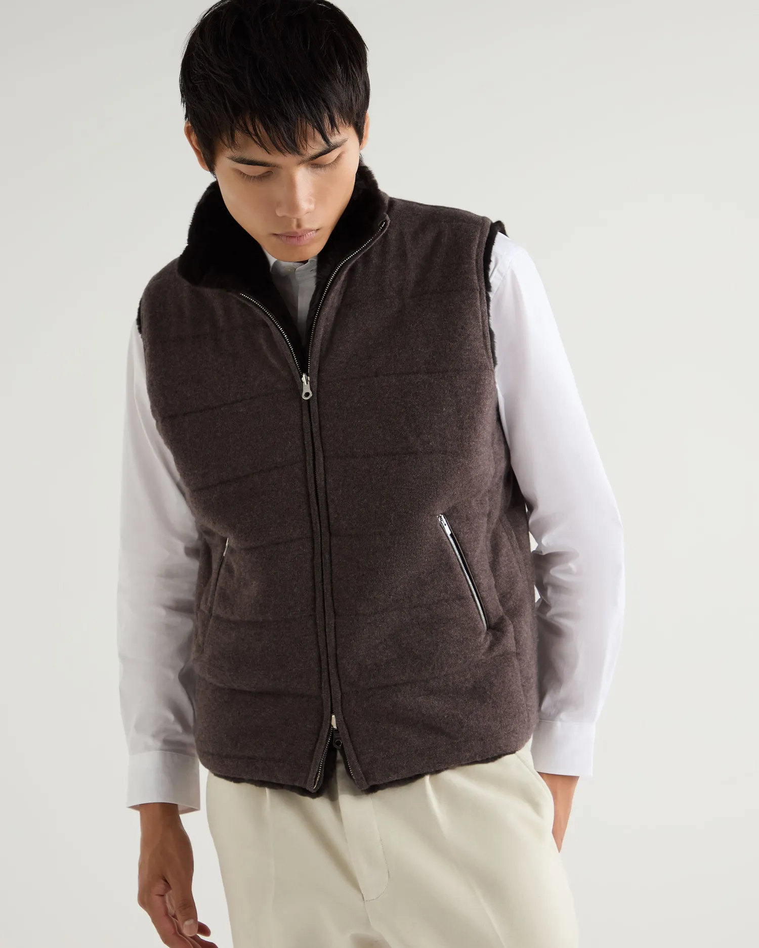 True luxury in a gilet – fur lined cashmere, what could be better? 100% cashmere and dark brown Rex fur – Quilted two layers of cashmere – Inner cotton down filling – Reverse in 100% rex fur with deep pile – Velvety texture – Fur attached by hand – Stunning gilet providing warmth, comfort and style – 1ply – Model is wearing size Medium – Care: Dry Clean Only