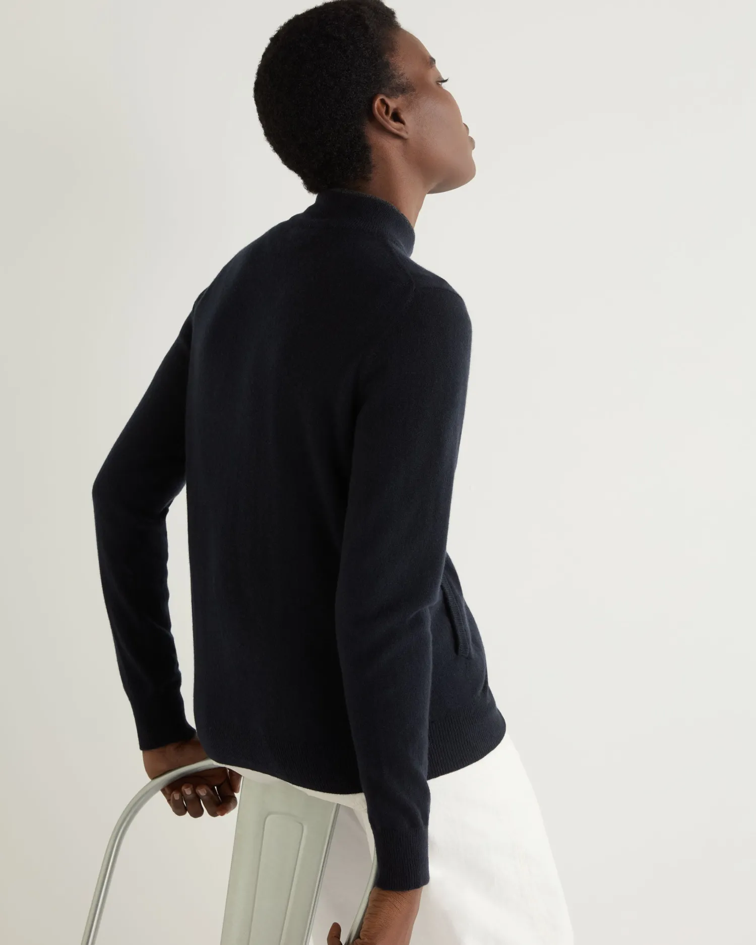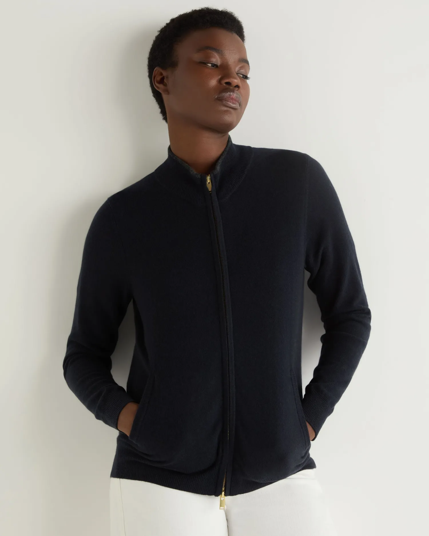 Keep warm and stylish in our funnel neck cashmere zip through. 100% Mongolian organic cashmere – Elegant two-way zip – Dark charcoal grey contrast trim- Jacket style piece – Perfect layering style – 1ply – Model is wearing size Small – Care: Hand Wash Organic cashmere: organic dyes and detergents, free from fertilizer and pesticides, find out more here