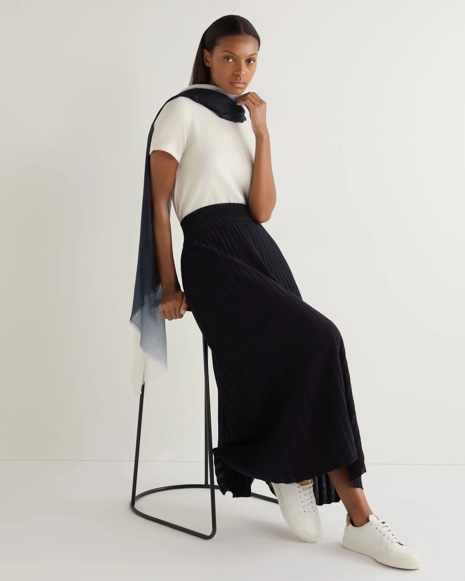 A masterpiece of elegance and sophistication – introducing our new superfine pleated skirt.n Made from 85% silk and 15% organic Mongolian cashmere This skirt is lightweight and drapes gracefully Beautifully creating a sleek silhouette that flatters every figure Effortlessly transitions from day to night Pair with a blouse or a cashmere sweater The soft, luxurious texture ensures maximum comfort 1ply Model is wearing size Small Care: Hand Wash