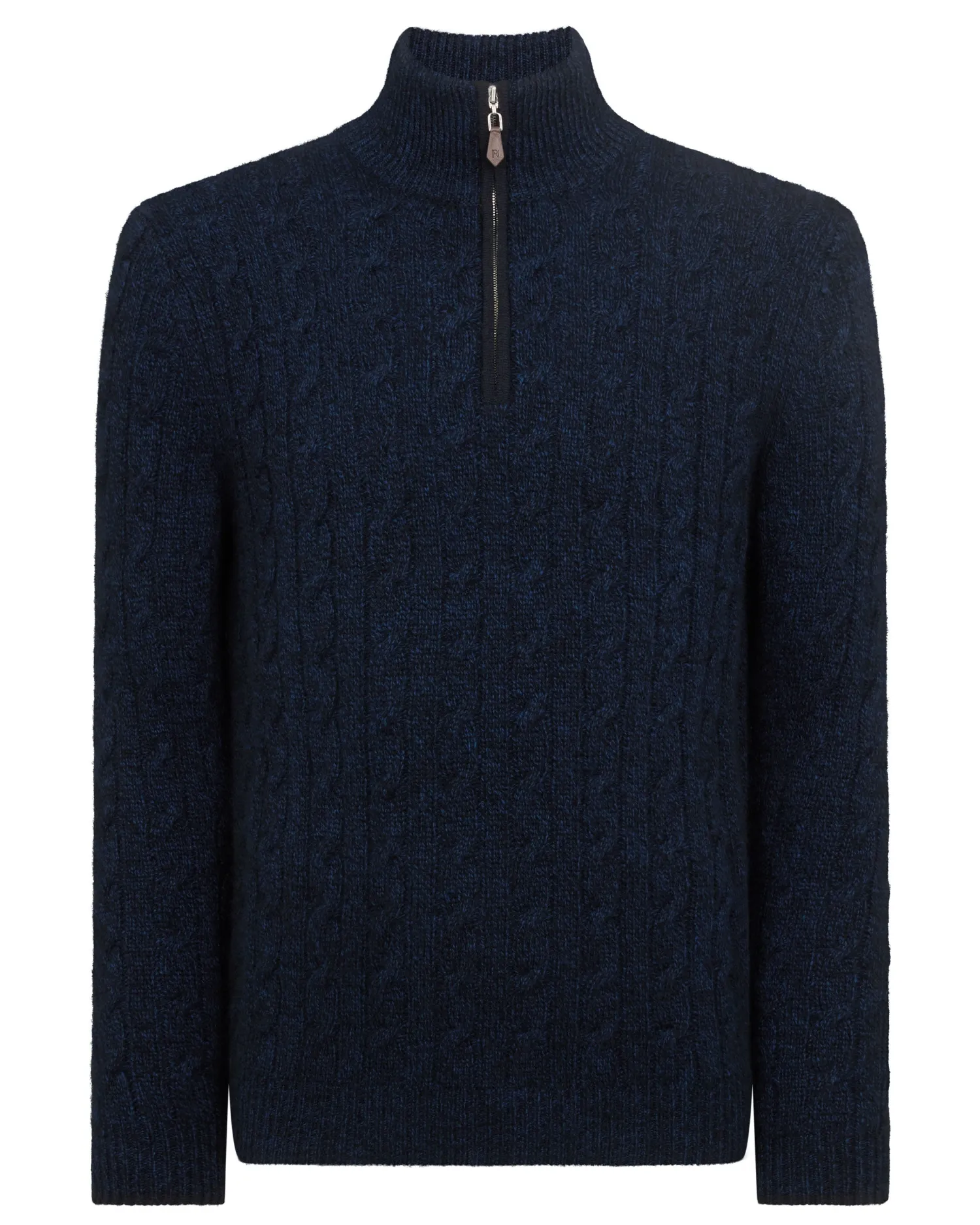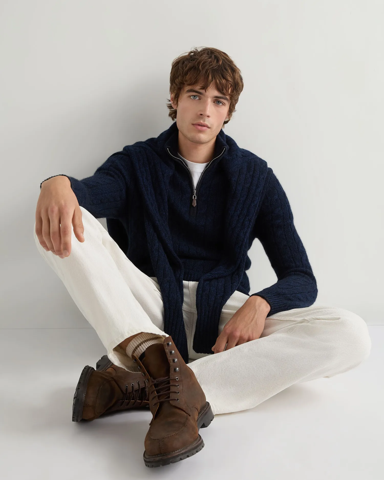 Here is a cable half zip cashmere sweater, beautiful and luxurious. 100% Mongolian organic cashmere – Cable knit design – Elegant half zip with leather toggle – Alcantara piping – Great layering piece – Delicate navy blue contrast on the cuff tip – 2ply – Model is wearing size Medium – Care: Dry Clean Only Organic cashmere: organic dyes and detergents, free from fertilizer and pesticides, find out more here