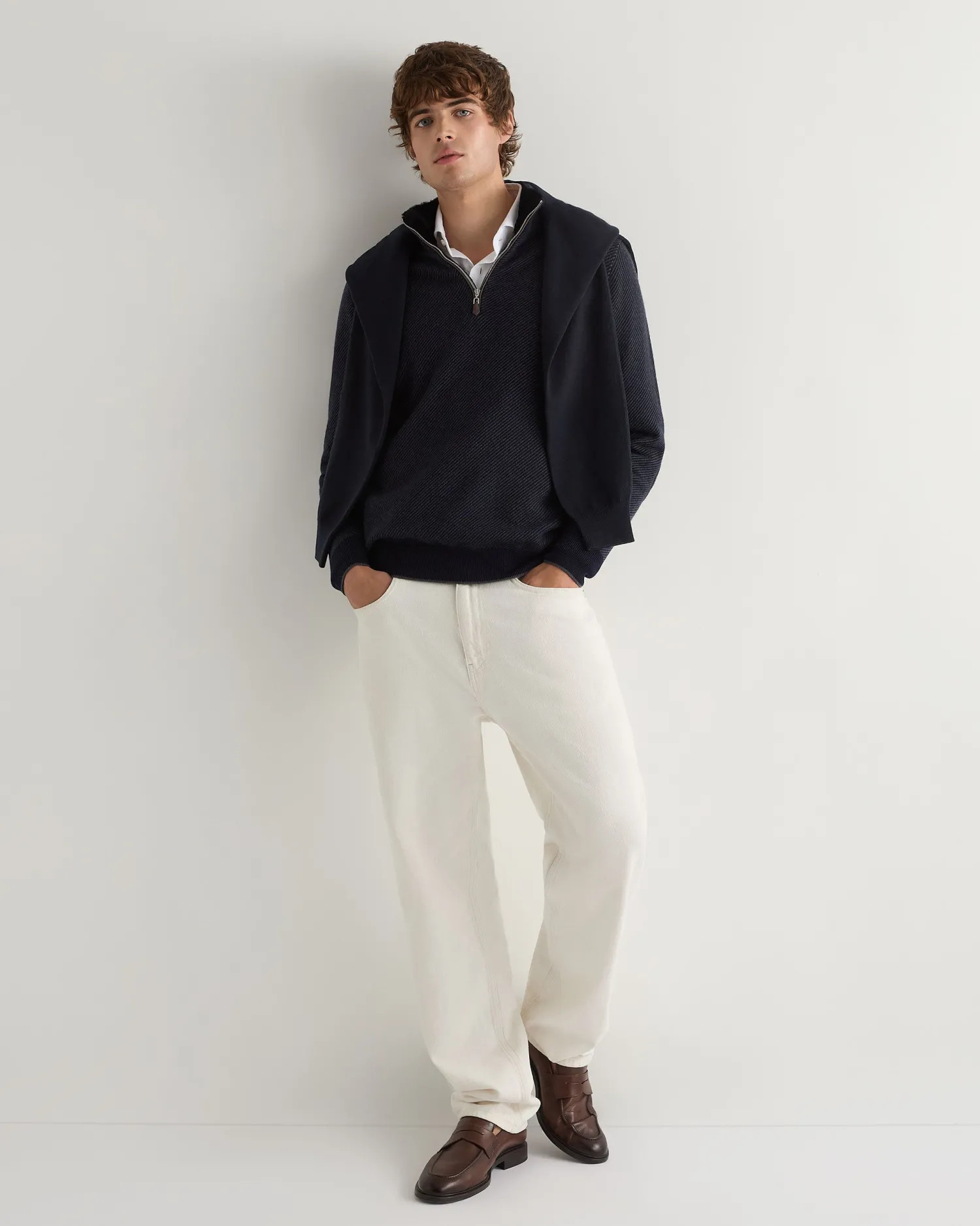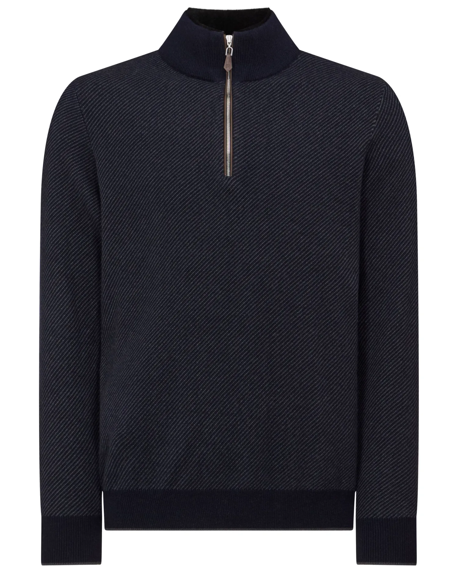 Another half zip to add to the collection, this time upscaled with a fur trim. Made from 100% organic Mongolian cashmere with a rex fur inner collar trim – Ever popular half zip style – Matching collar, cuffs and hem – Combining navy blue and anthracite grey with a navy blue coloured rex fur trim on the inner collar – Ecru tipping on hem and cuffs – Delightful stitch pattern – 1ply – Model is wearing size Medium – Care: Dry Clean Only Organic cashmere: organic dyes and detergents, free from fertilizer and pesticides, find out more here