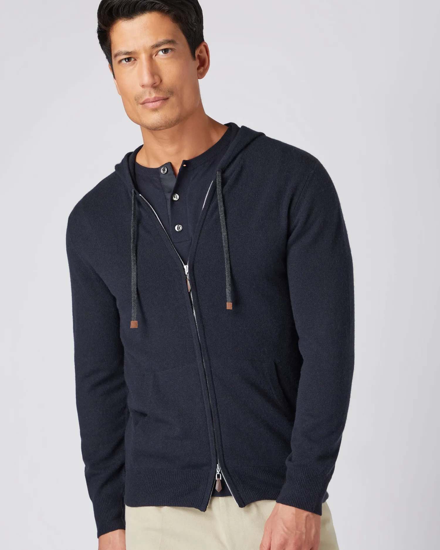Leisure and luxury is combined here in a cashmere hooded zipped top.- 100% Mongolian Organic Cashmere- Full length two way zip- Smart Alcantara toggle- Dark charcoal grey contrast drawstring- Ultimate in casual cashmere- Model is wearing size Medium- Care: Dry Clean Only Organic cashmere: organic dyes and detergents, free from fertilizer and pesticides, find out more here