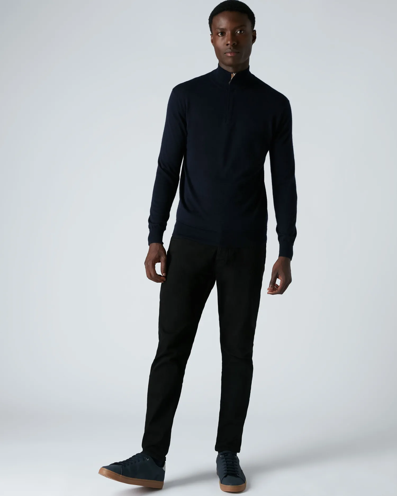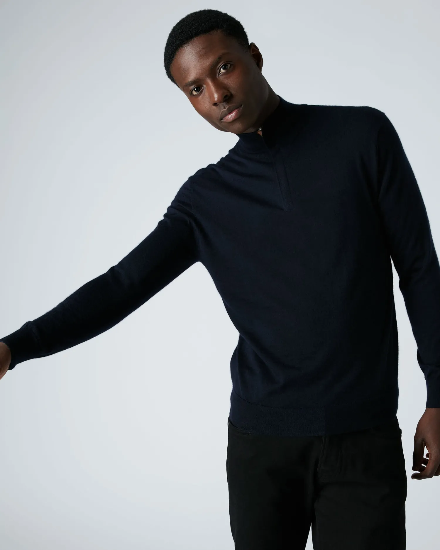 The Regent, our half zip fine gauge Summer weight sweater. Made using a worsted yarn comprising 70% Cashmere and 30% Silk – A lighter Summer-weight garment – The perfect transitional piece – 30% Silk gives a coolness to the touch – Elegant half zip style with Alcantara trim – Great worn over formal shirts and T shirts alike – A sartorial staple, an investment in enduring style- Our fine gauge products have a naturally slimmer fit, if you’d like a looser fit (like our other products) or are between sizes, we suggest you size up- Model is wearing size Medium- Care: Dry Clean OnlynFind our full range of Men’s Fine Gauge Cashmere Jumpers here.