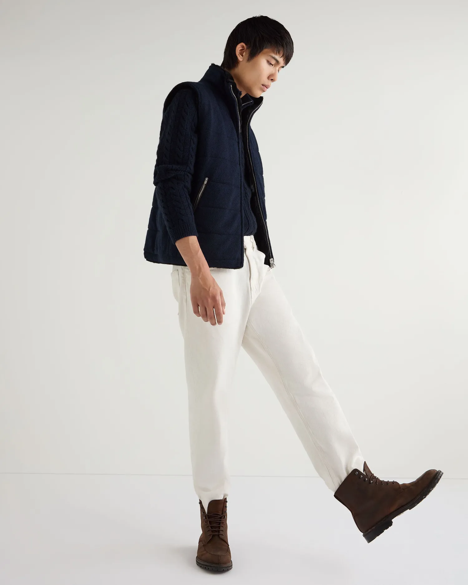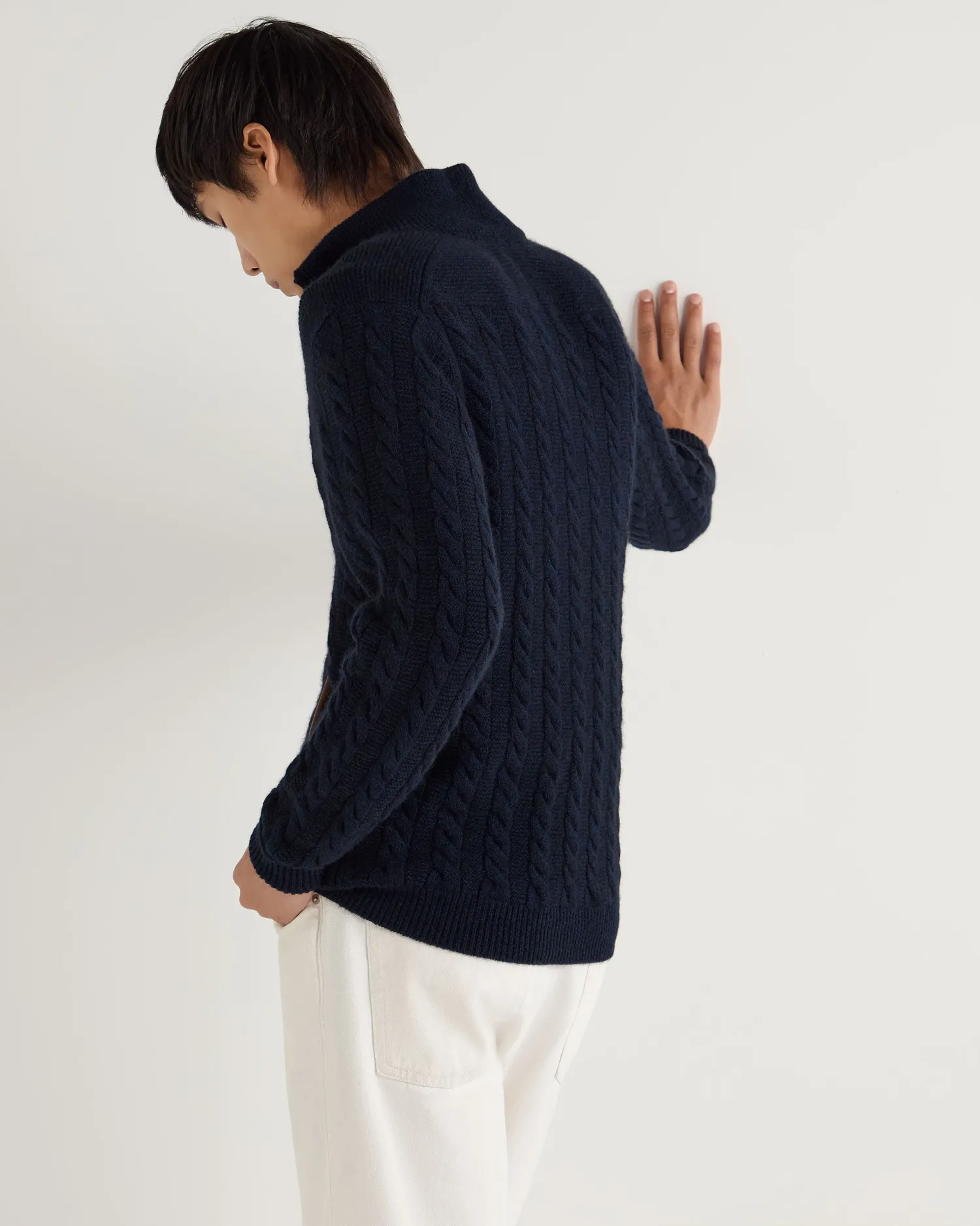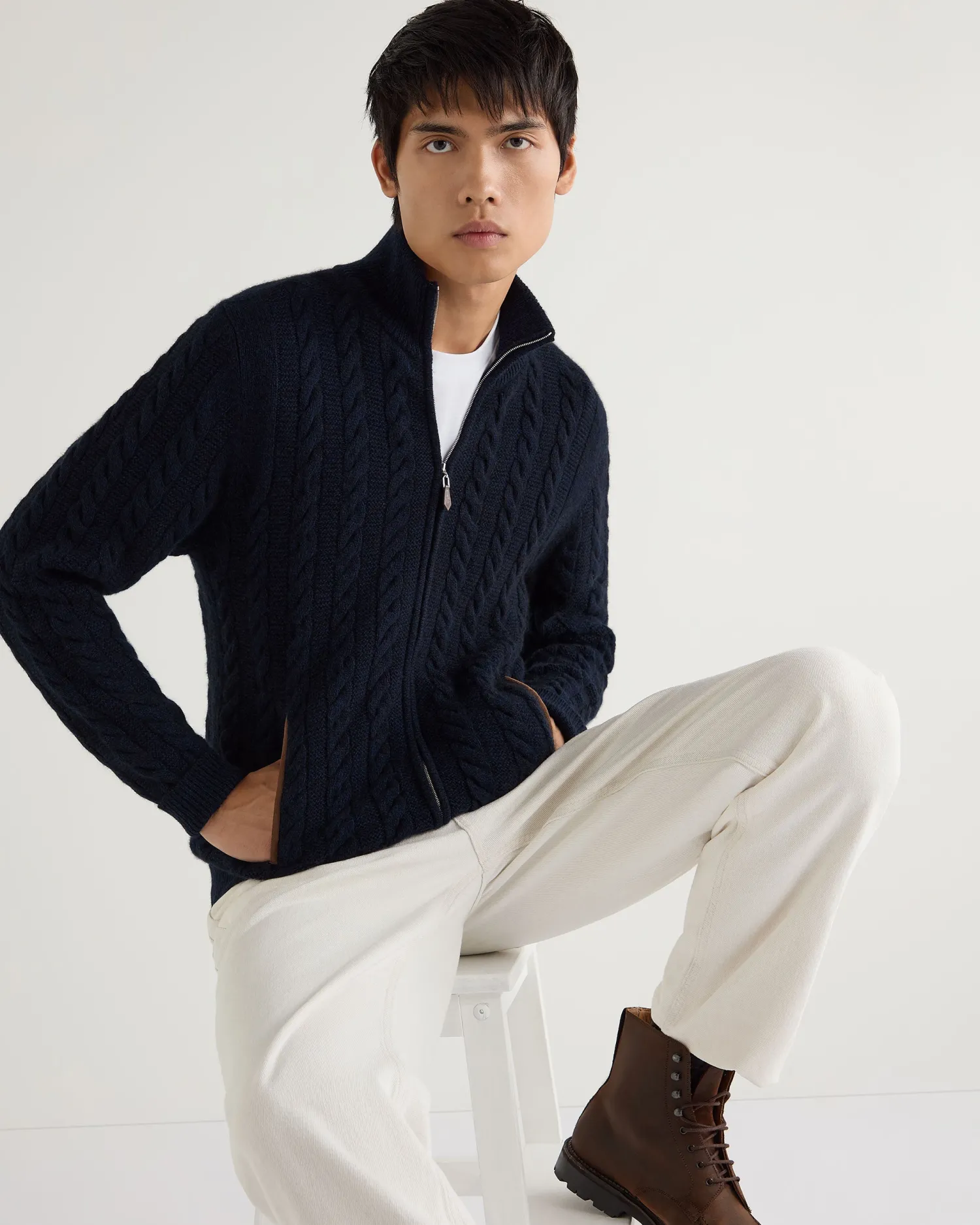 The Richmond – a cashmere cable cardigan beyond compare. n 100% Mongolian cashmere Attractive cable knit Handsome chunky knit Hand sewn Alcantara piping Two pockets Full length two way zip 3ply Model is wearing size Medium Care: Dry Clean Only