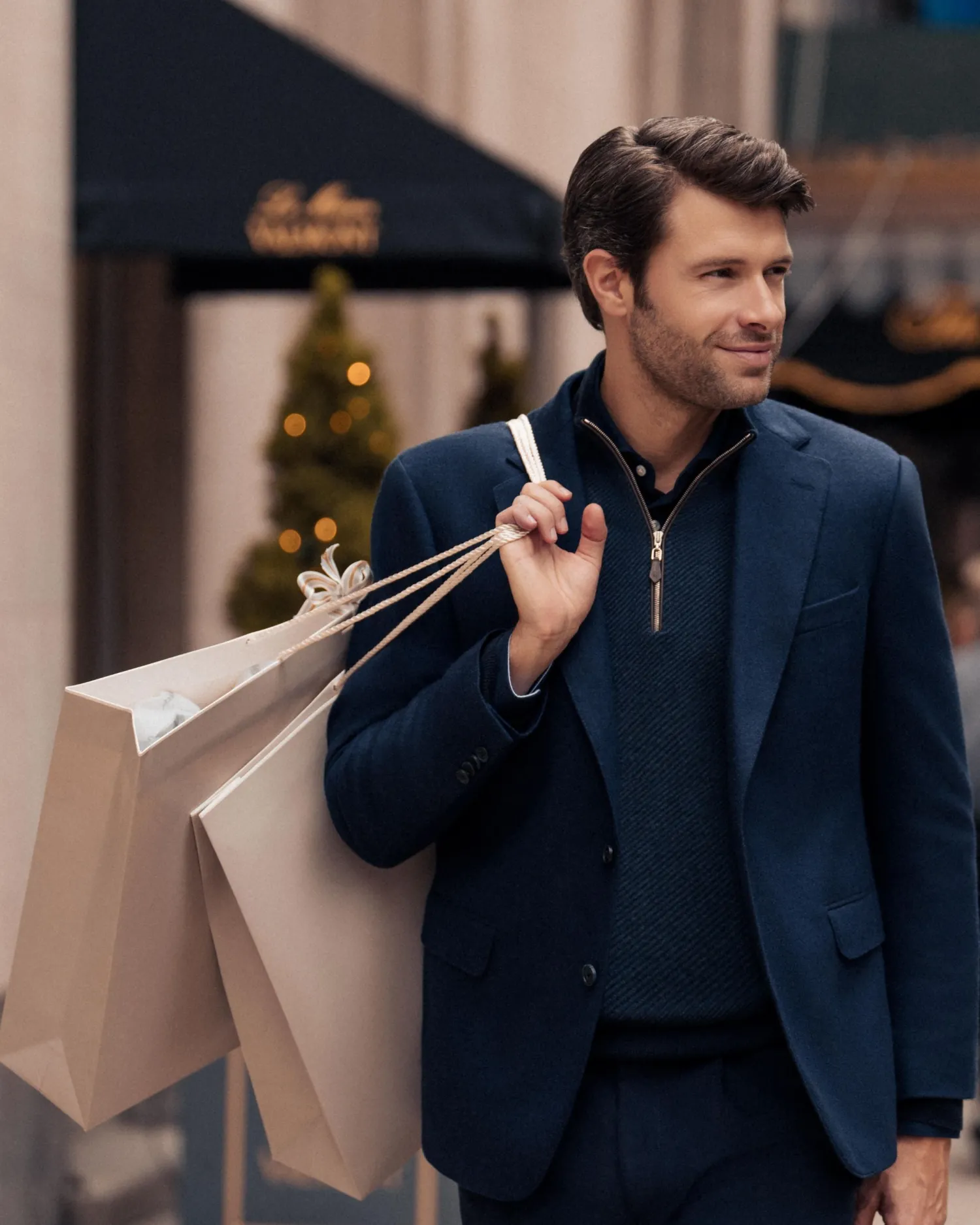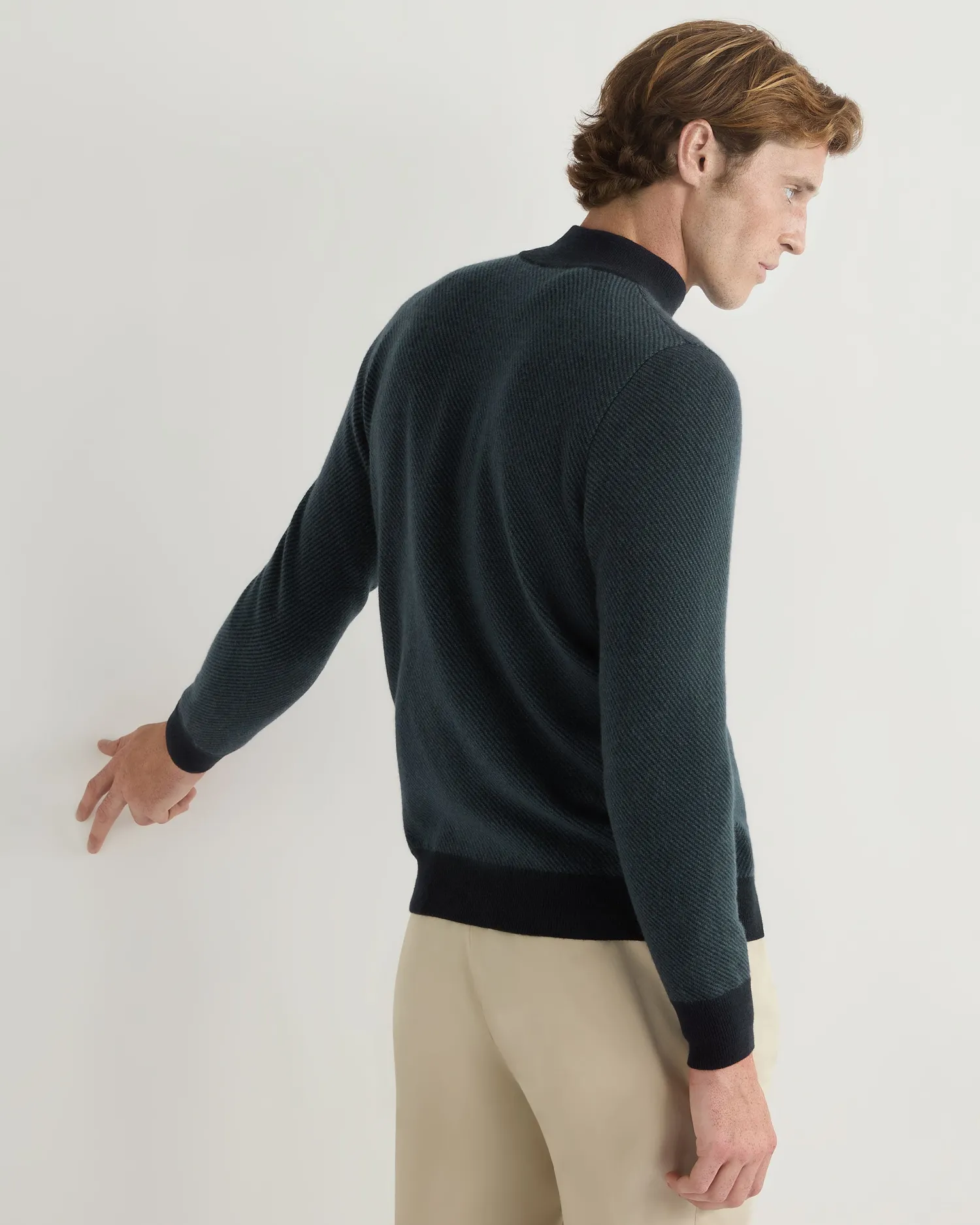 Our half zip ‘Carnaby’ style looking incredible here with a new diagonal stripe knit. Made from 100% organic Mongolian cashmere- Half zip style with our signature leather toggle- Ingenious diagonal stitch pattern in navy blue and caviar blue- Elegant new gents style with matching contrast collar, hem and cuffs- 1ply- Model is wearing size Medium- Care: Dry Clean Only Organic cashmere: organic dyes and detergents, free from fertilizer and pesticides, find out more heren