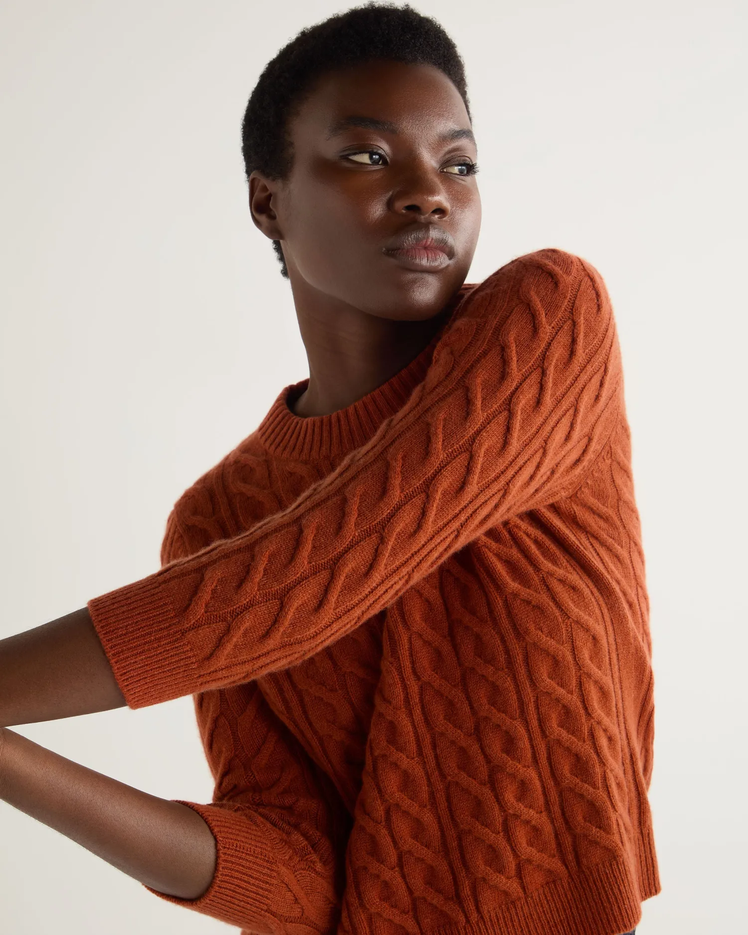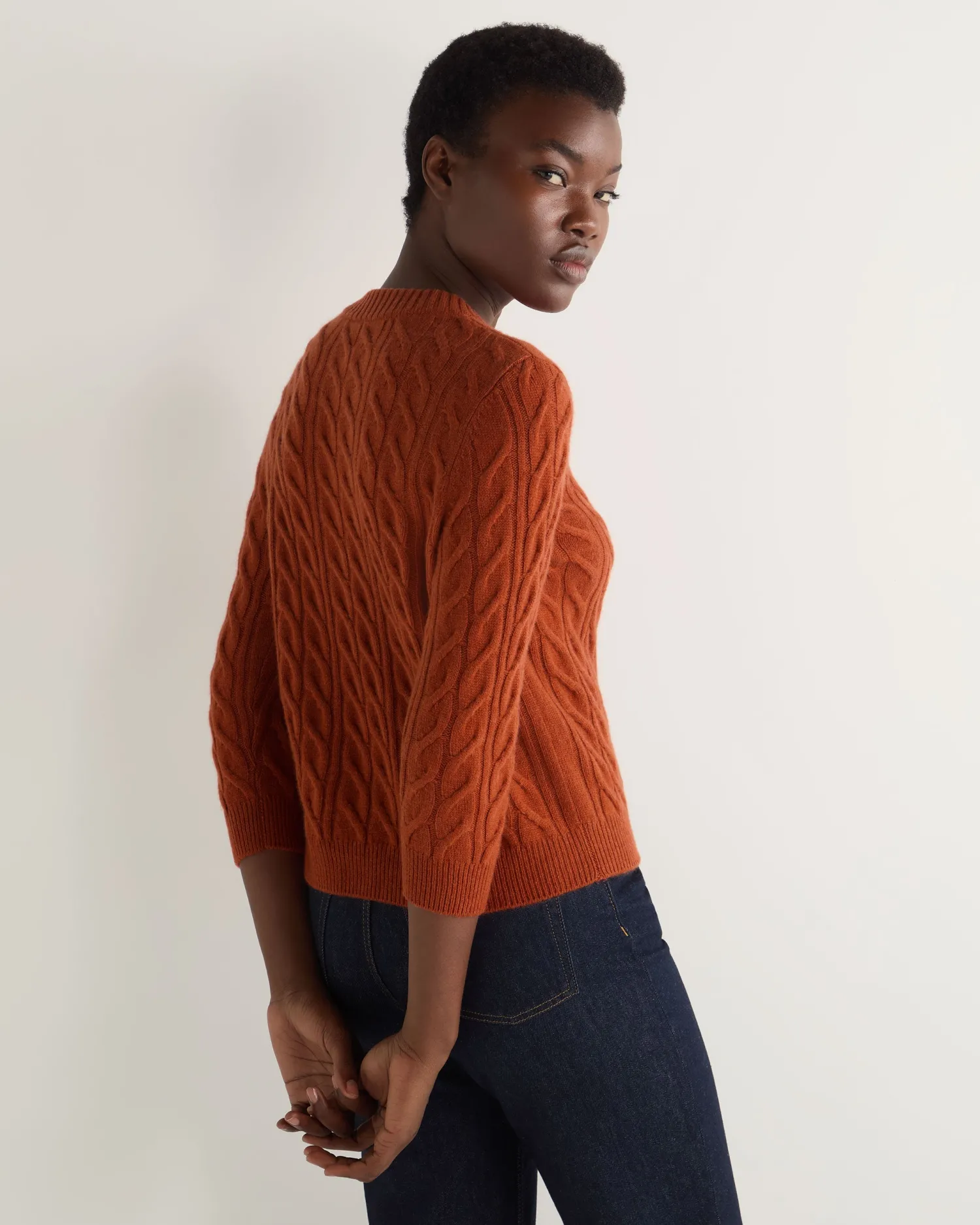 Take a look at this beautiful round neck sweater in cable cashmere. Crafted from 100% Mongolian organic cashmere – Modern look shorter boxy style – More contemporary fit – Modern cable knit pattern – 3/4 length sleeves – Matching rib cuffs and collar – Elegant ribbed round neck – 2ply – Model is wearing size Small – Care: Hand Wash Organic cashmere: organic dyes and detergents, free from fertilizer and pesticides, find out more here