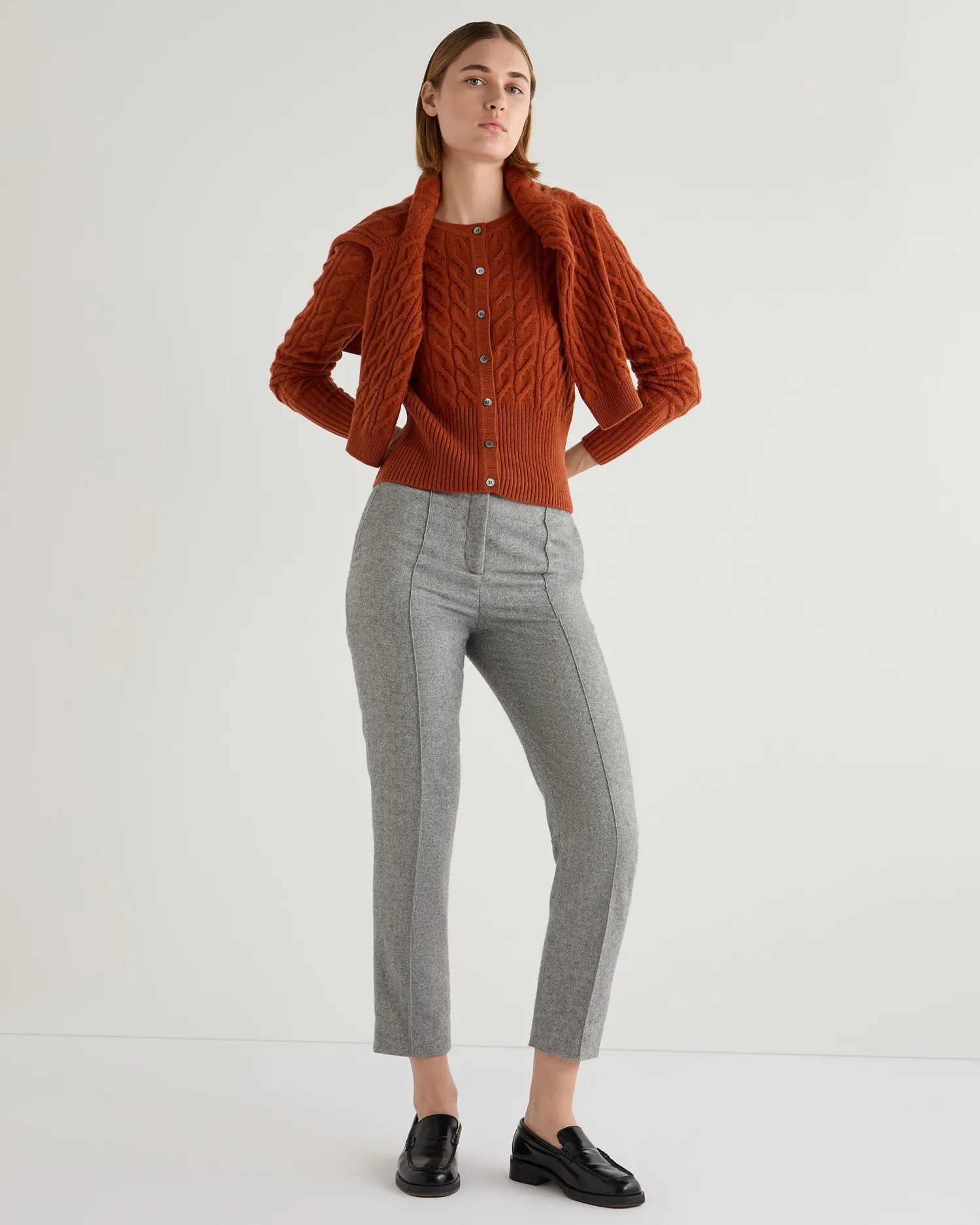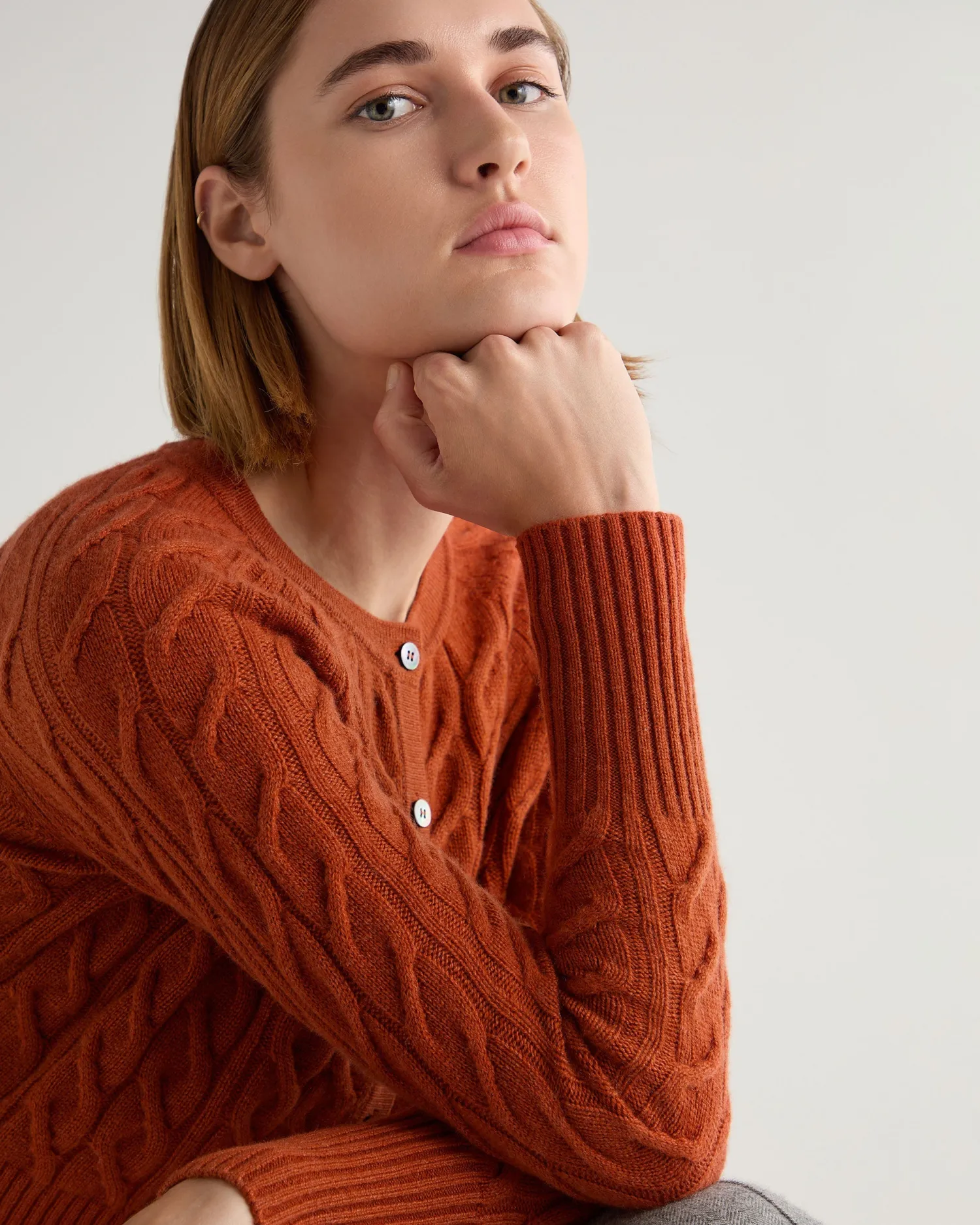 A wonderfully simple and stylish cable cashmere cardigan. Crafted from 100% Mongolian organic cashmere – Popular cropped cardigan style – Modern cable texture – Mother of pearl buttons – Deep ribbed hem and matching cuffs – 2ply – Model is wearing size Small – Care: Hand Wash Organic cashmere: organic dyes and detergents, free from fertilizer and pesticides, find out more here