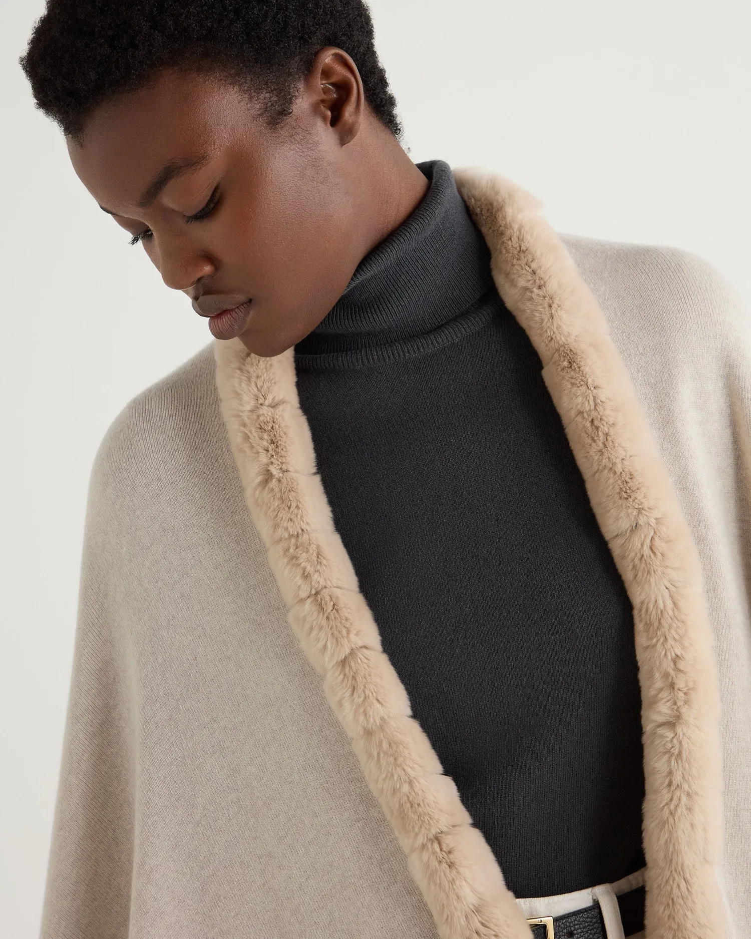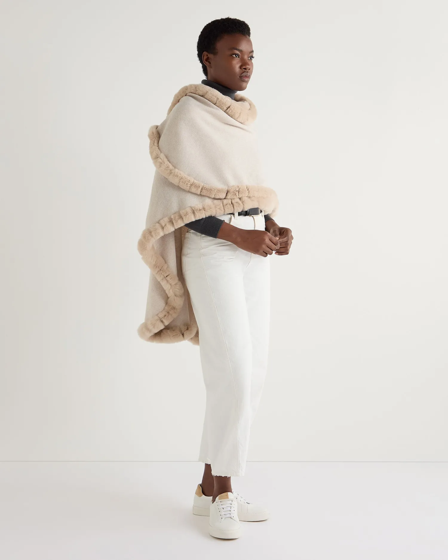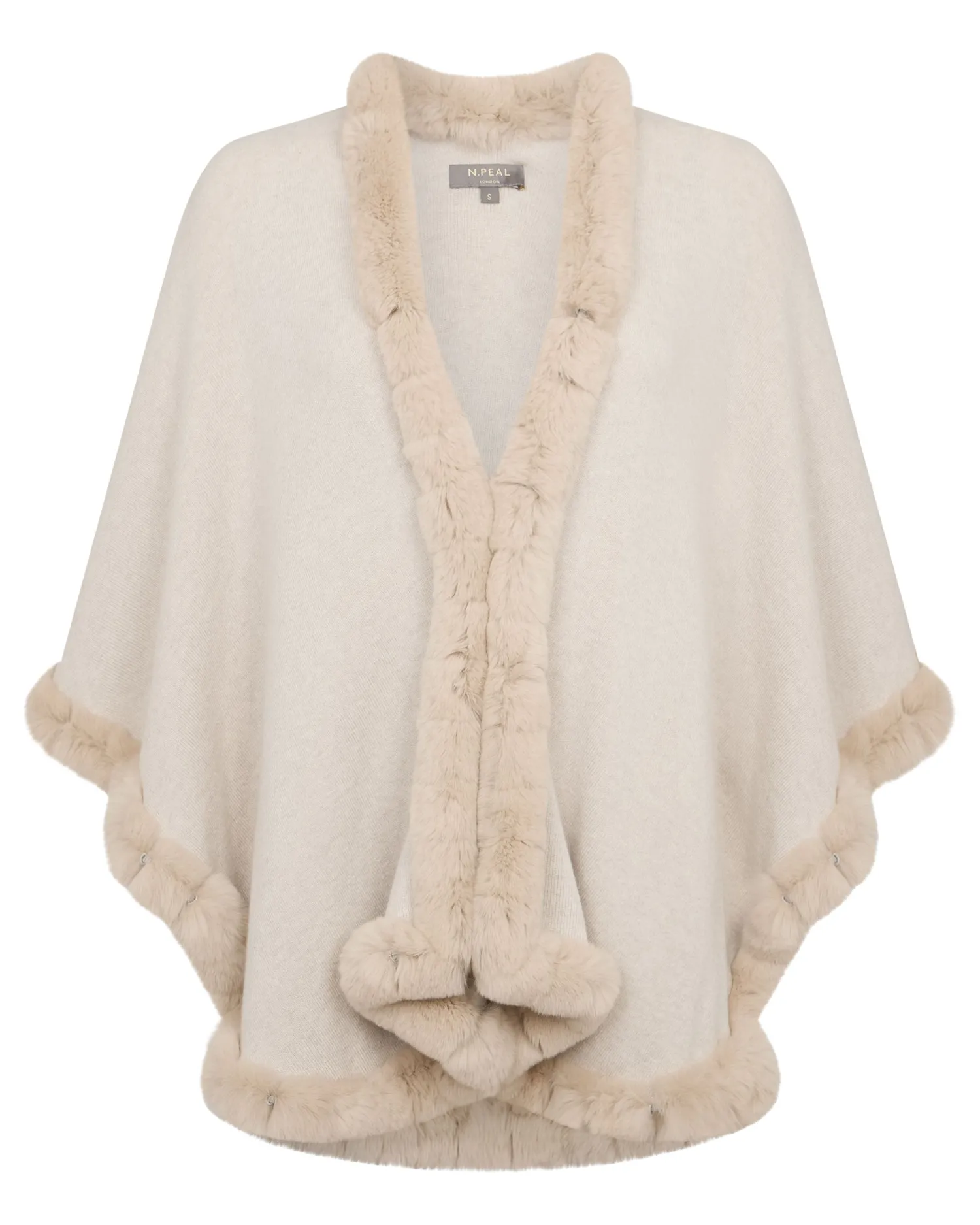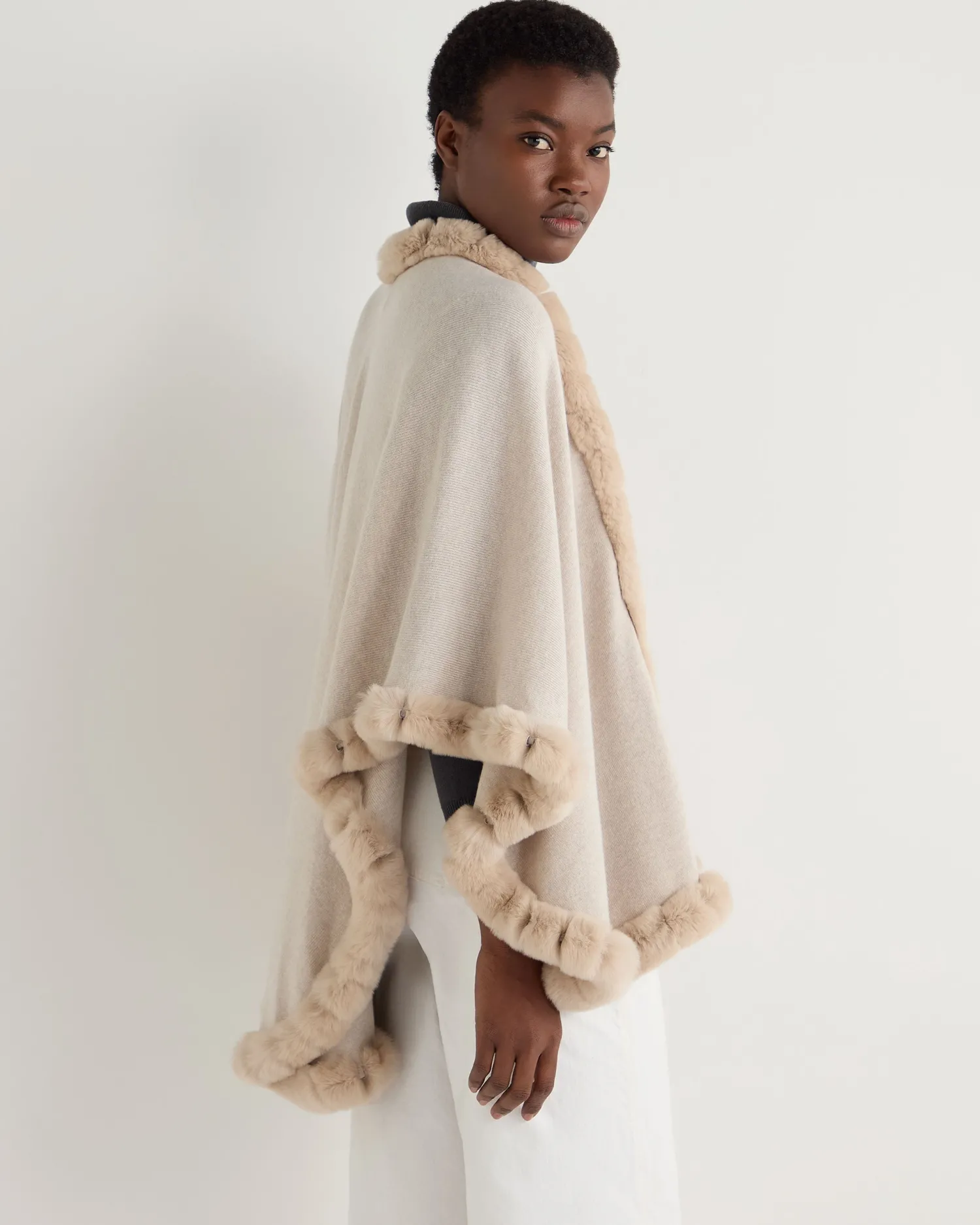 A fabulous cape embellished with a with fur trim edge. 100% Mongolian Cashmere and Rex Fur trim- Sand brown tipped Rex rabbit fur trim edging- Indulgent and luxurious- Traditionally elegant- 1Ply- Model is wearing size Small- Care: Dry Clean Onlyn