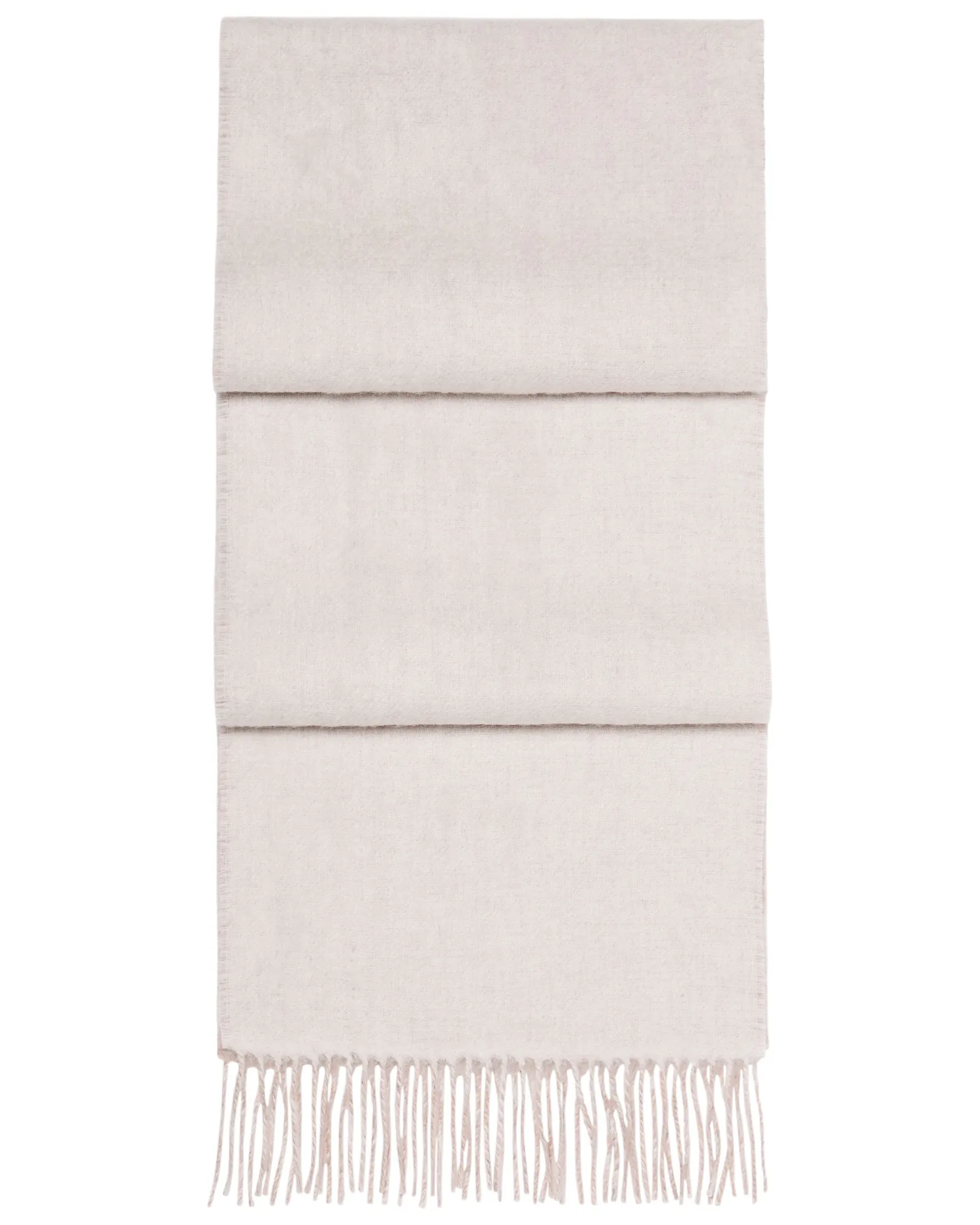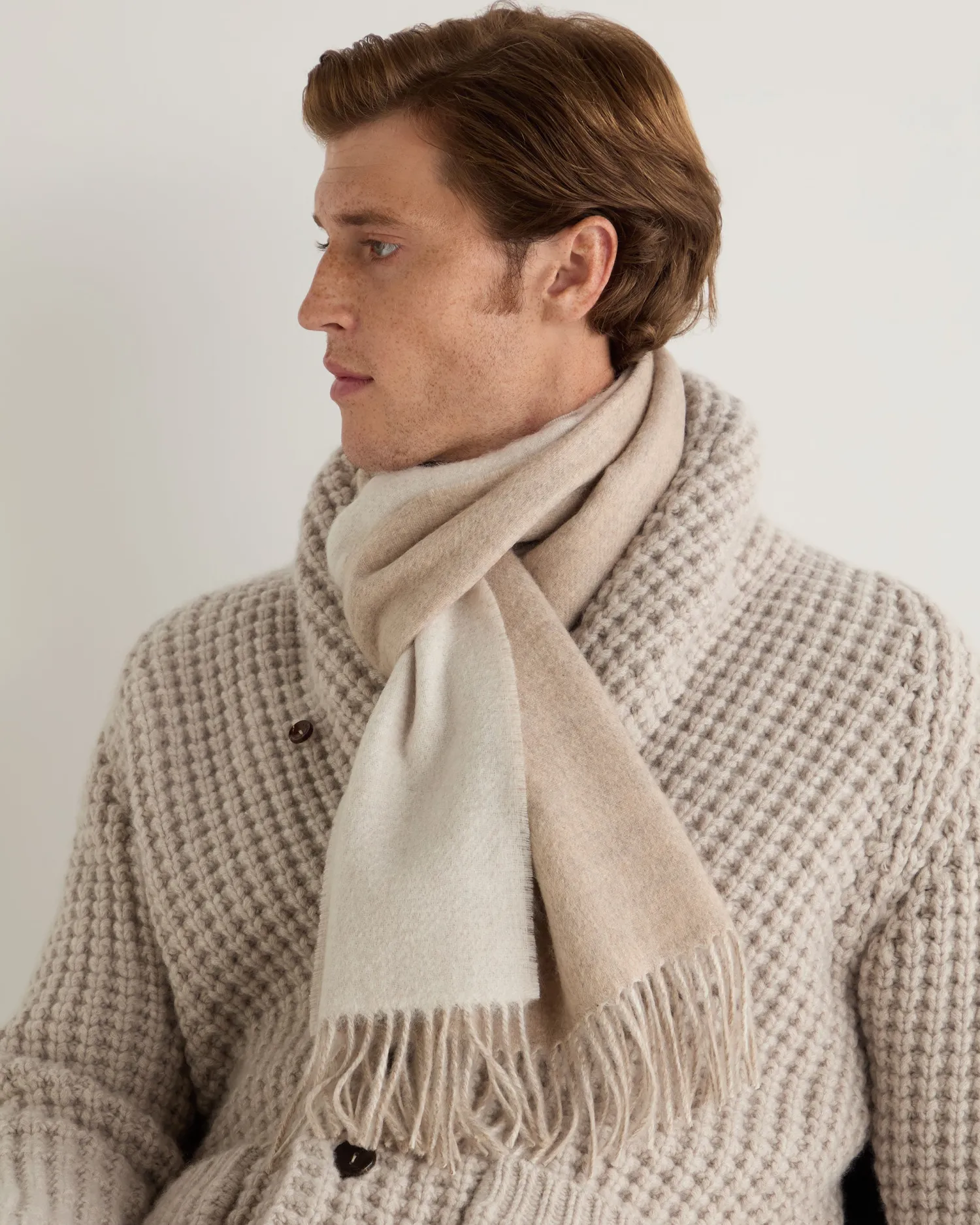 Double cashmere for double luxury, the ultimate scarf. Made from a double layer of 100% Mongolian woven cashmere – Measures a generous 175 x 30cm – The doubleface style gives a wonderful contrast colour look, in frost white and oatmeal brown- Woven rather than knitted for extra structure – Beautifully soft and warm – Delightfully soft against the skin – Care: Dry Clean Only