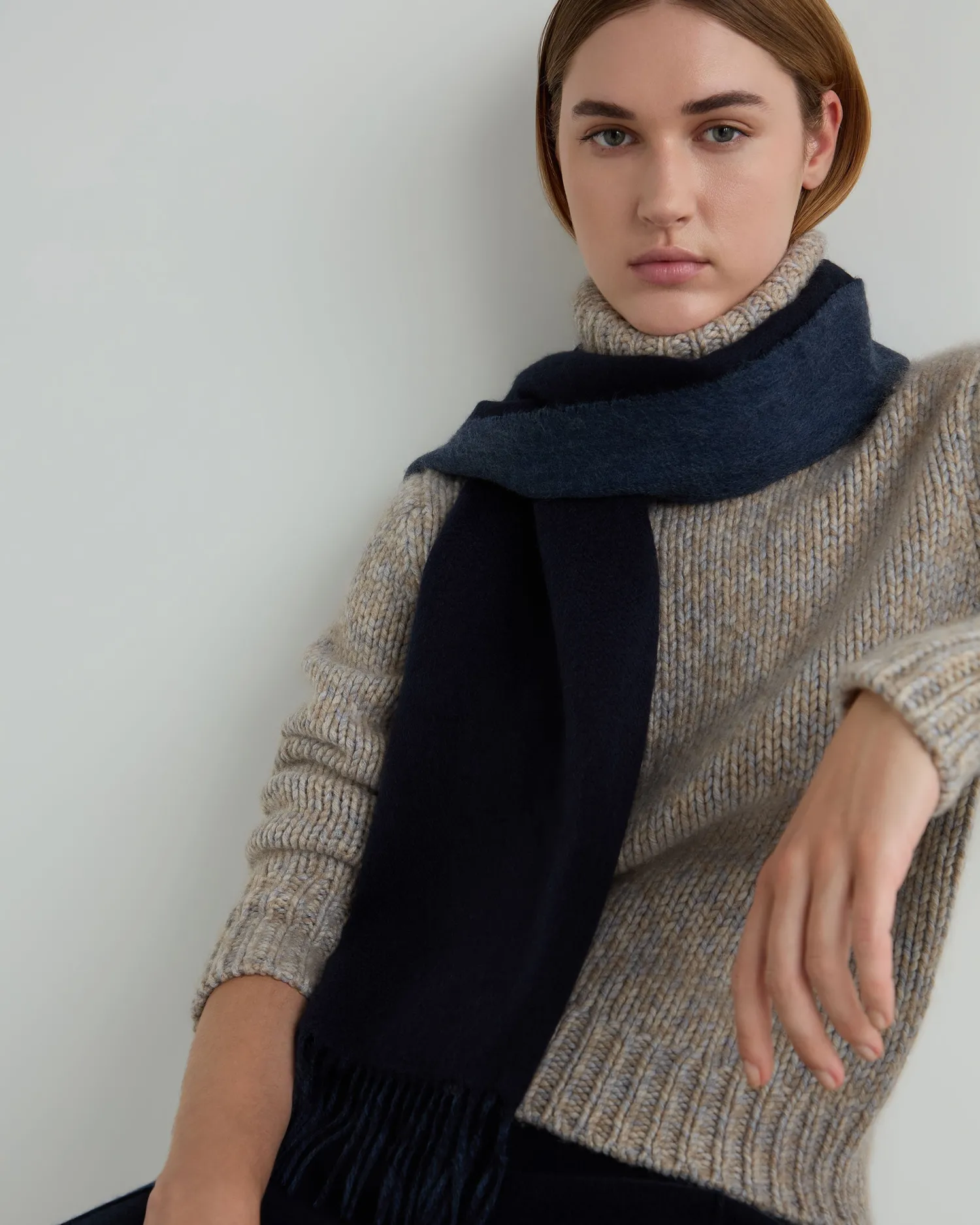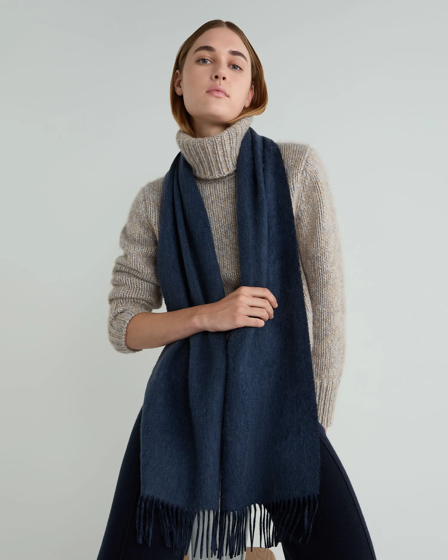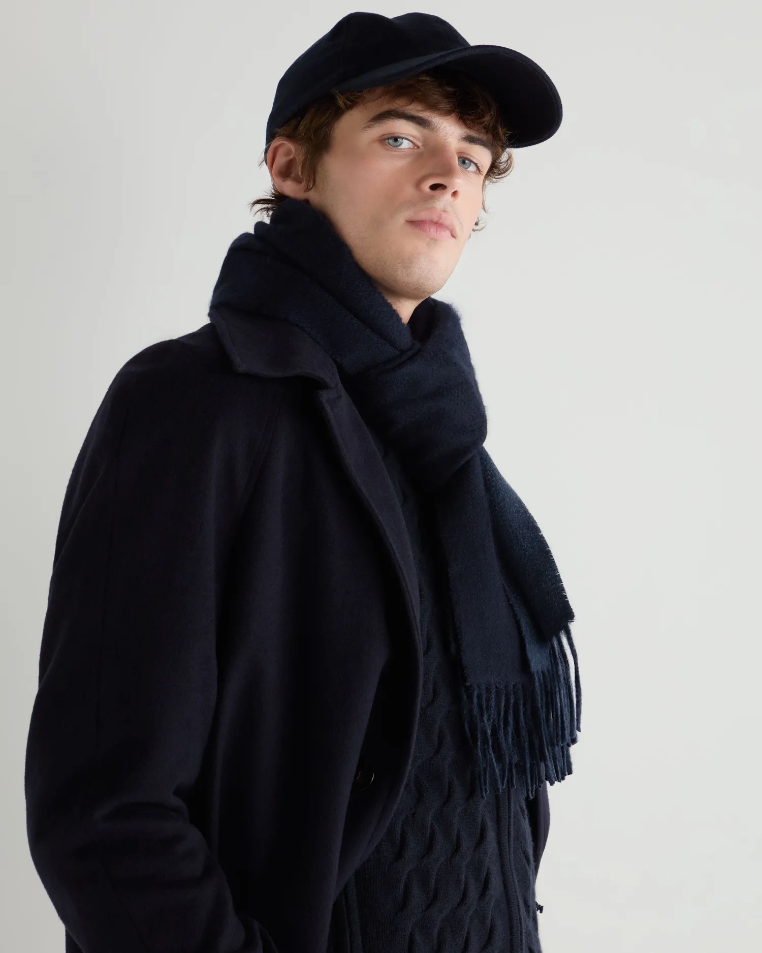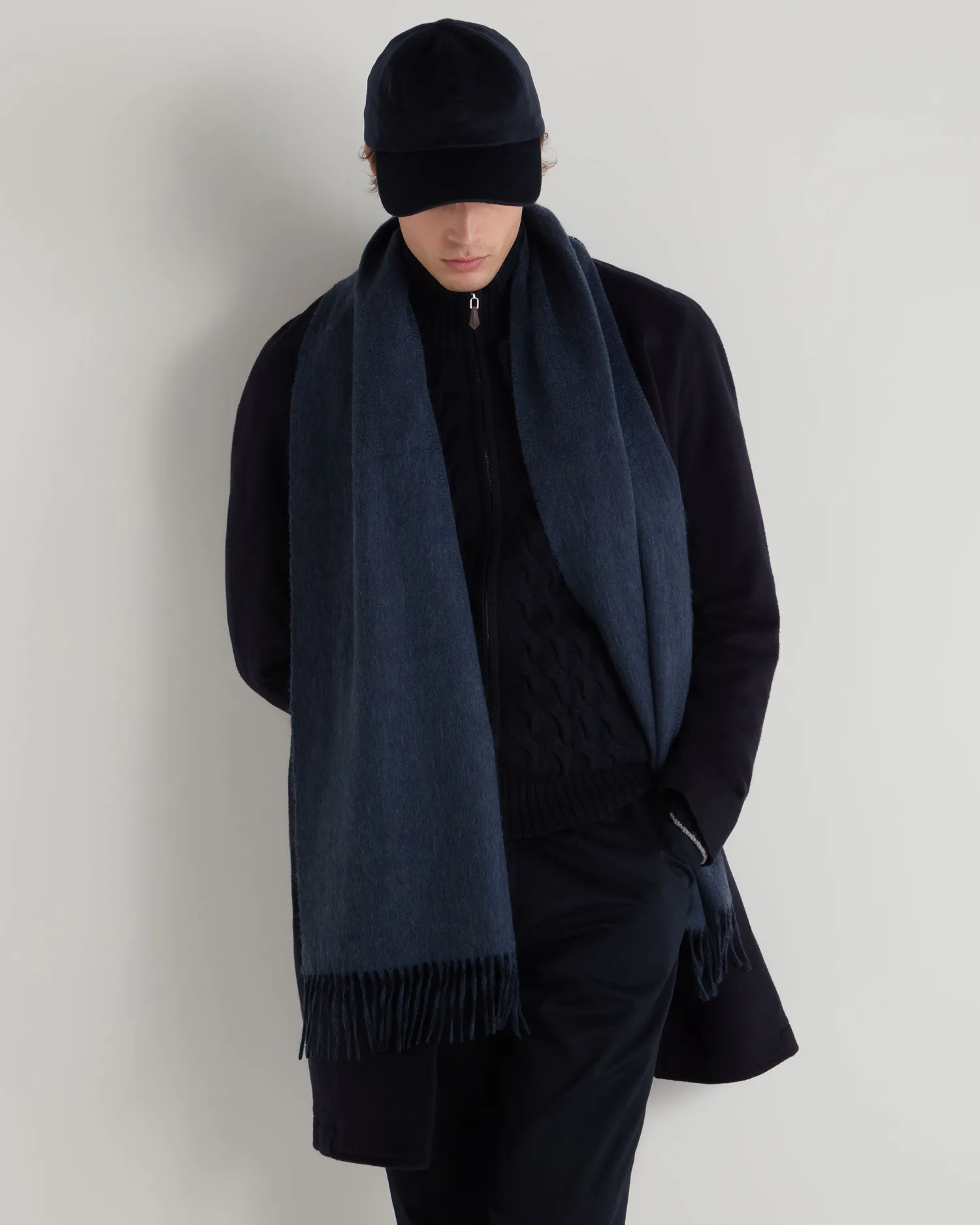 Double cashmere for double luxury, the ultimate scarf. Made from a double layer of 100% Mongolian woven cashmere – Measures a generous 175 x 30cm – The doubleface style gives a wonderful contrast colour look, in navy blue and caviar blue- Woven rather than knitted for extra structure – Beautifully soft and warm – Delightfully soft against the skin – Care: Dry Clean Only