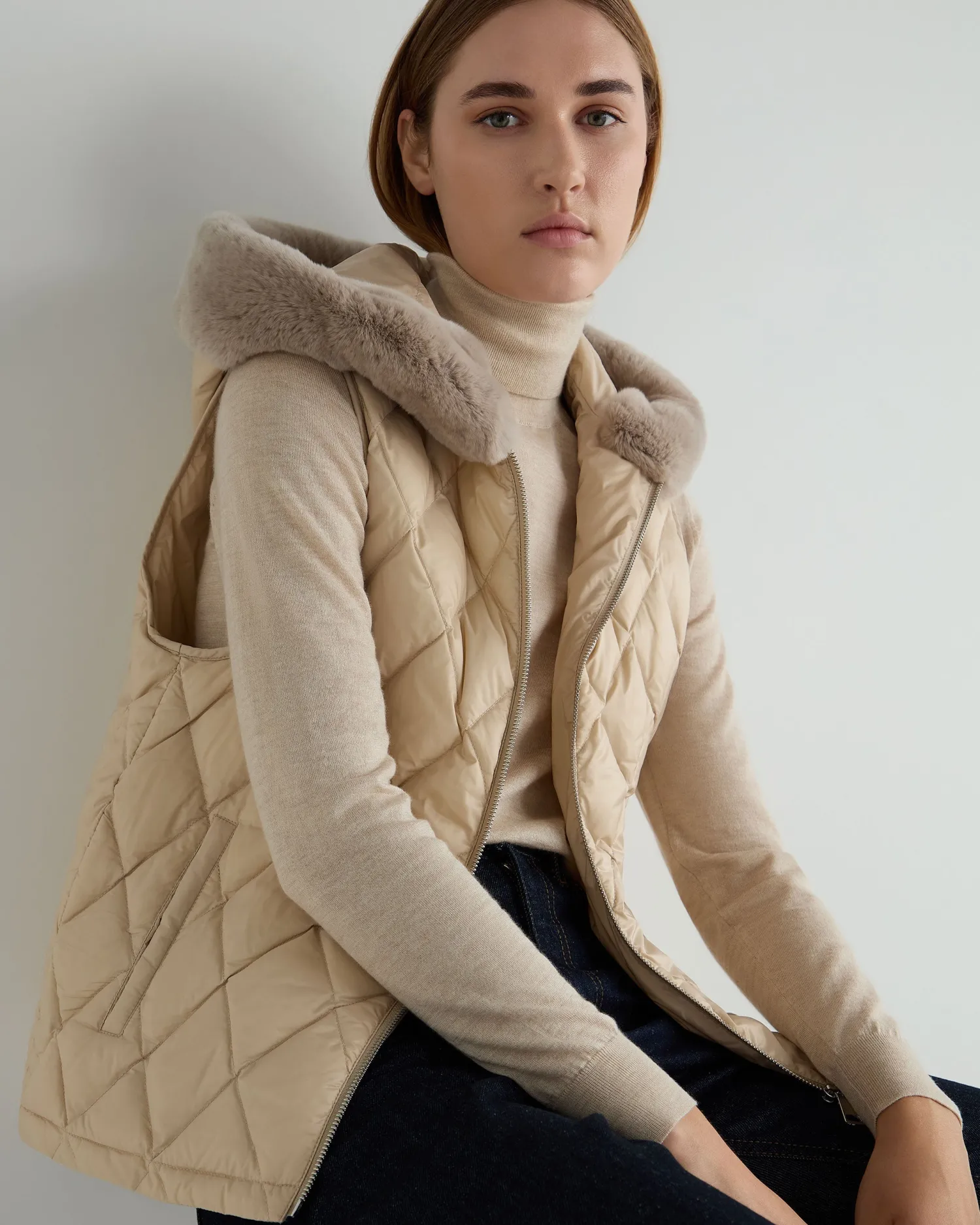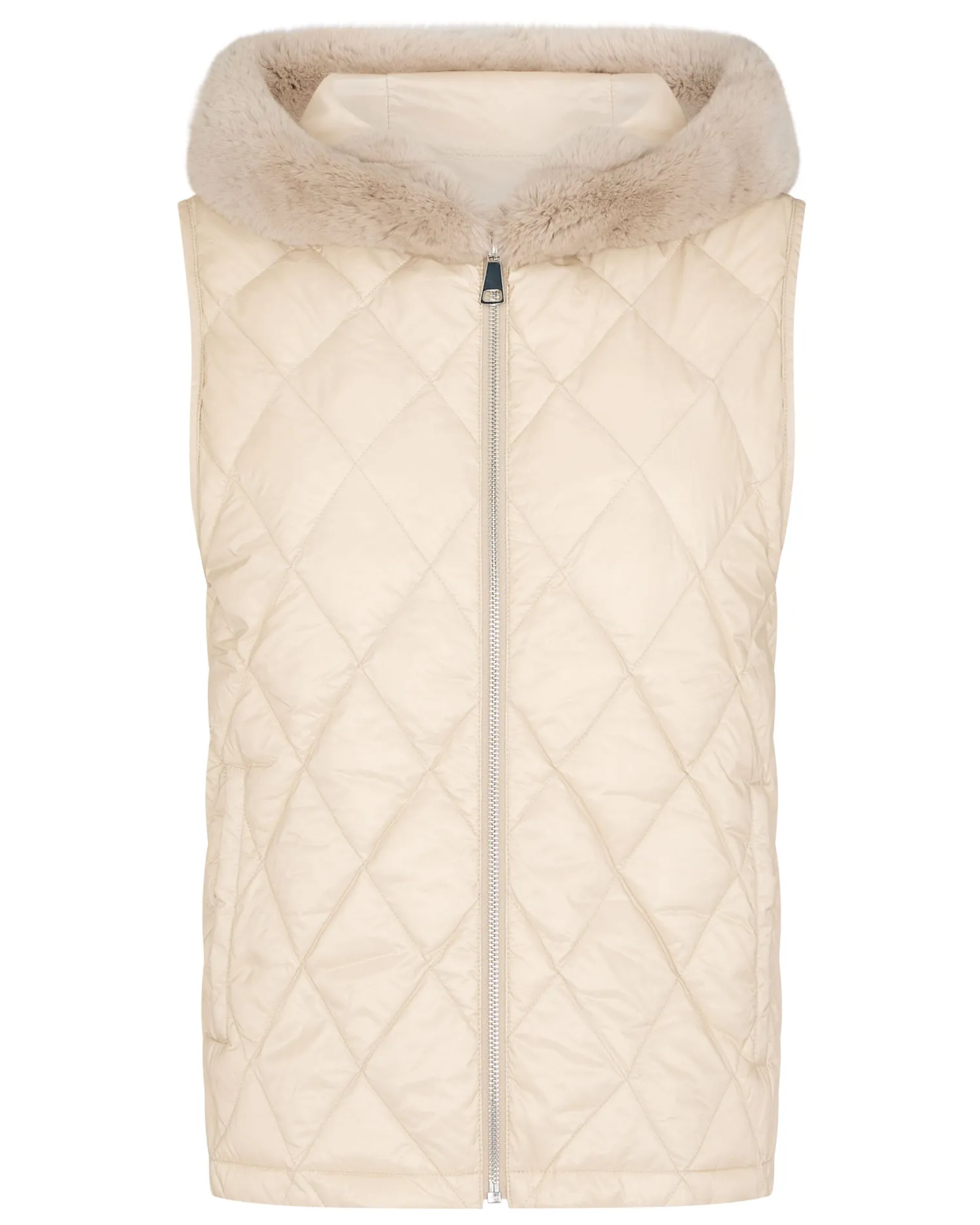 Stay stylishly warm with our new ladies down gilet with a gorgeous rex fur hood.n Made from 100% polyester outer with duck down membrane, and a 100% Rex fur trim Featuring a striking diamond stitch pattern across the body, adding texture and a refined touch to its design The beautiful fur hood offers an extra layer of warmth This gilet provides lightweight insulation without compromising on style This versatile design allows for effortless layering over your favourite sweaters Featuring a zip and side welt pockets Impeccably soft, comfortable and stylish Model is wearing size Small Care: Dry Clean Only