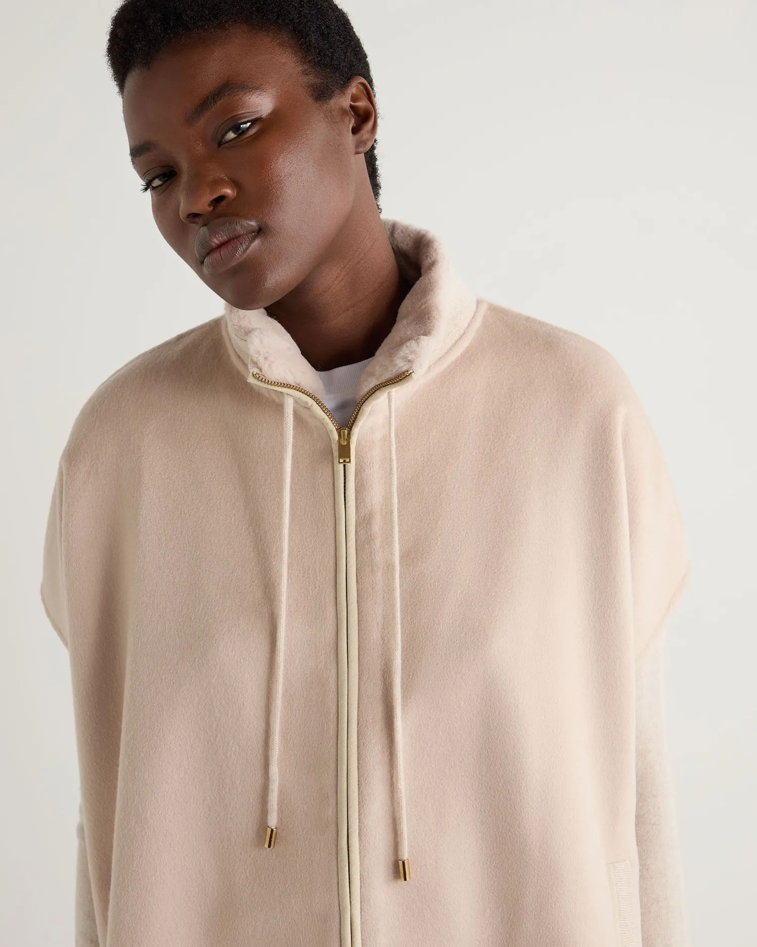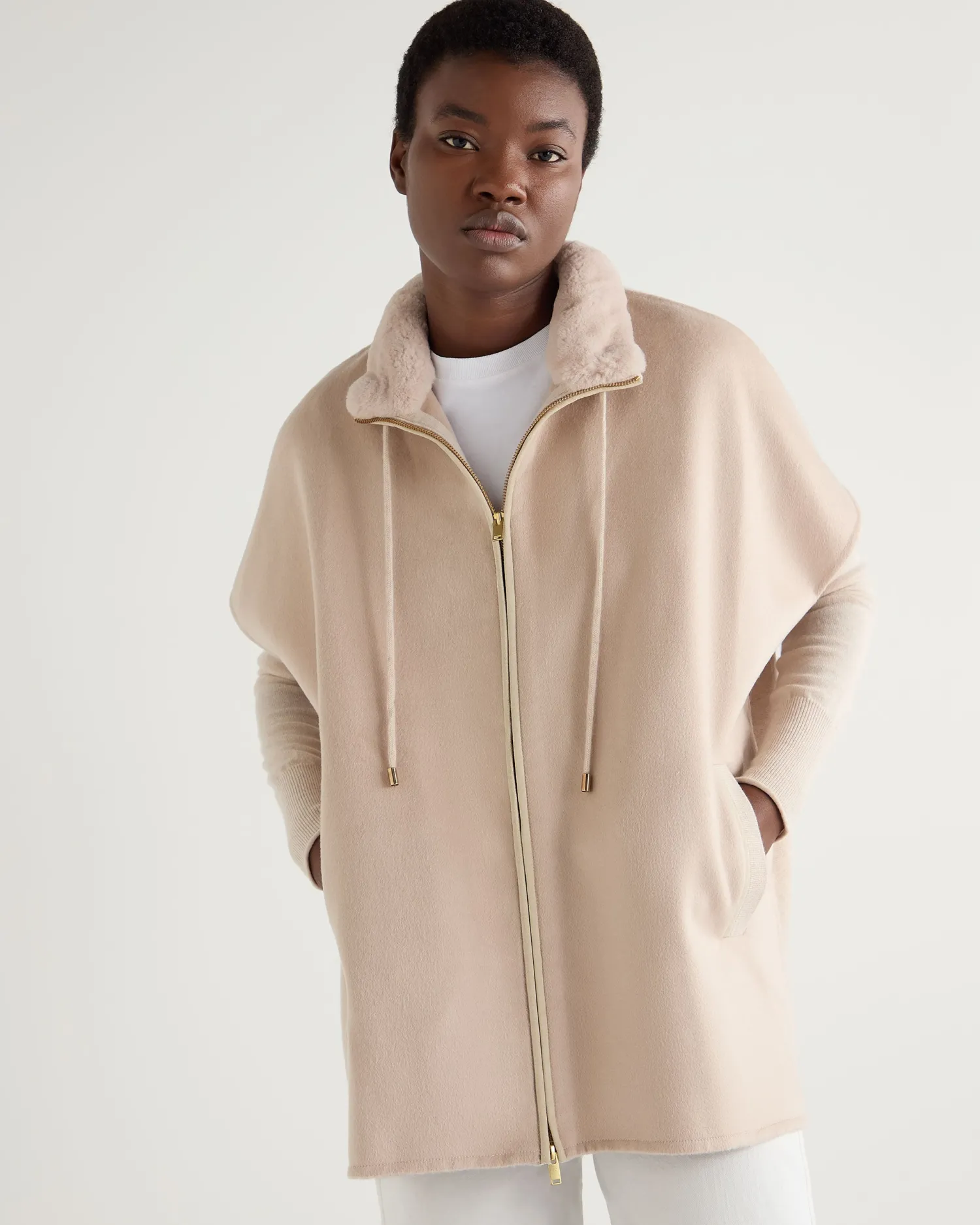 The Emery woven mix cape by N.Peal is the epitome of luxury and warmth, designed to make a statement in any setting.n Made from 100% organic Mongolian cashmere and a fur trim collar Exquisite fur trim collar that adds a touch of opulence, perfectly complementing the intricate woven fabric Featuring a gold two-way zip, with matching toggles Thoughtfully placed pockets enhance the cape’s practicality Whether draped over evening wear or elevating a casual ensemble, its an essential in any wardrobe Luxuriously soft, comfortable, versatile yet ever so stylish 1ply Care: Dry Clean Only