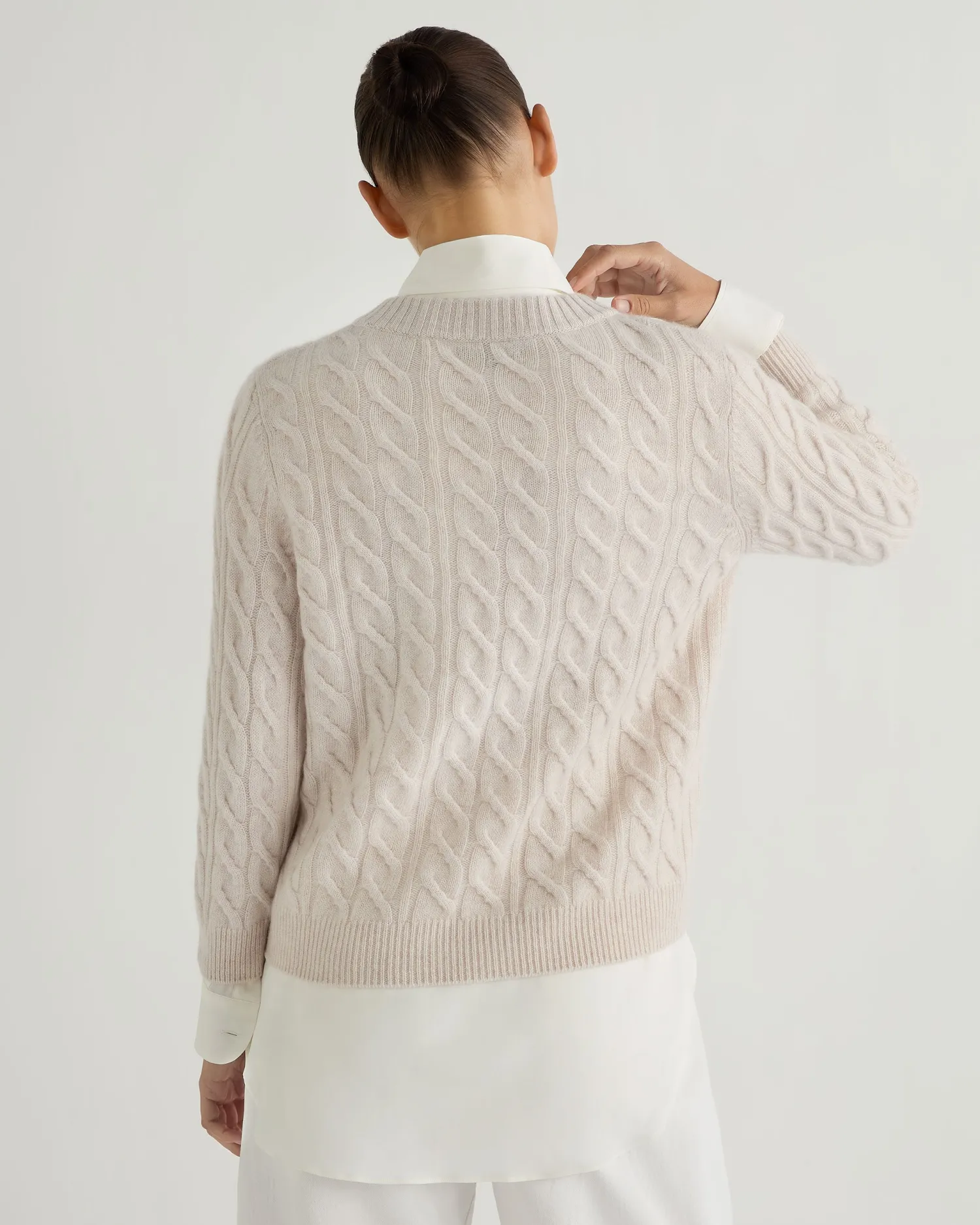 Take a look at this beautiful round neck sweater in cable cashmere. Crafted from 100% Mongolian organic cashmere – Modern look shorter boxy style – More contemporary fit – Modern cable knit pattern – 3/4 length sleeves – Matching rib cuffs and collar – Elegant ribbed round neck – 2ply – Model is wearing size Small – Care: Hand Wash Organic cashmere: organic dyes and detergents, free from fertilizer and pesticides, find out more here
