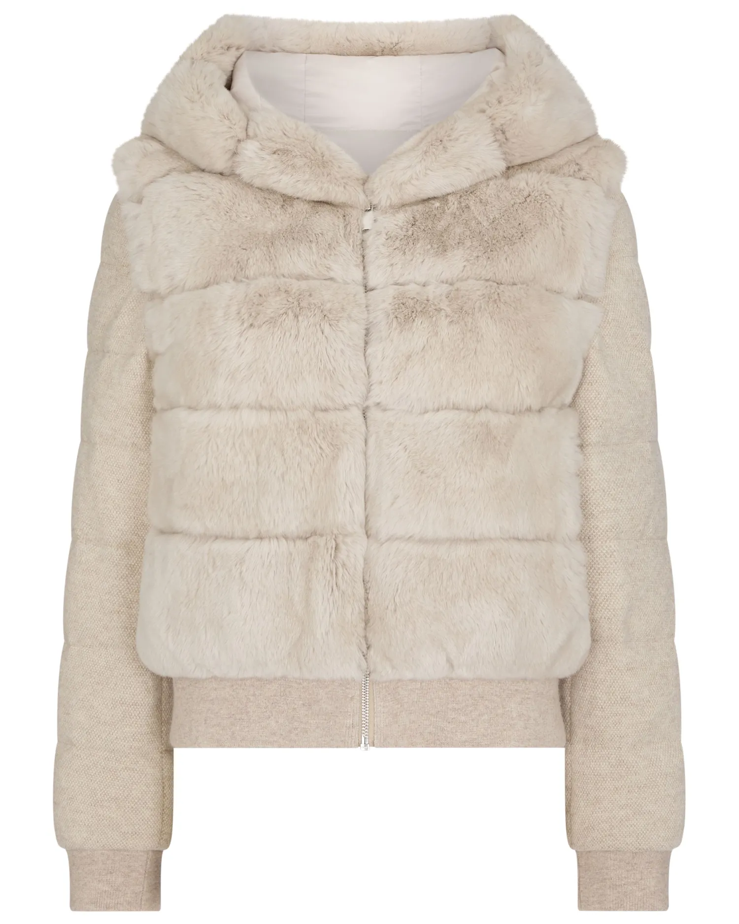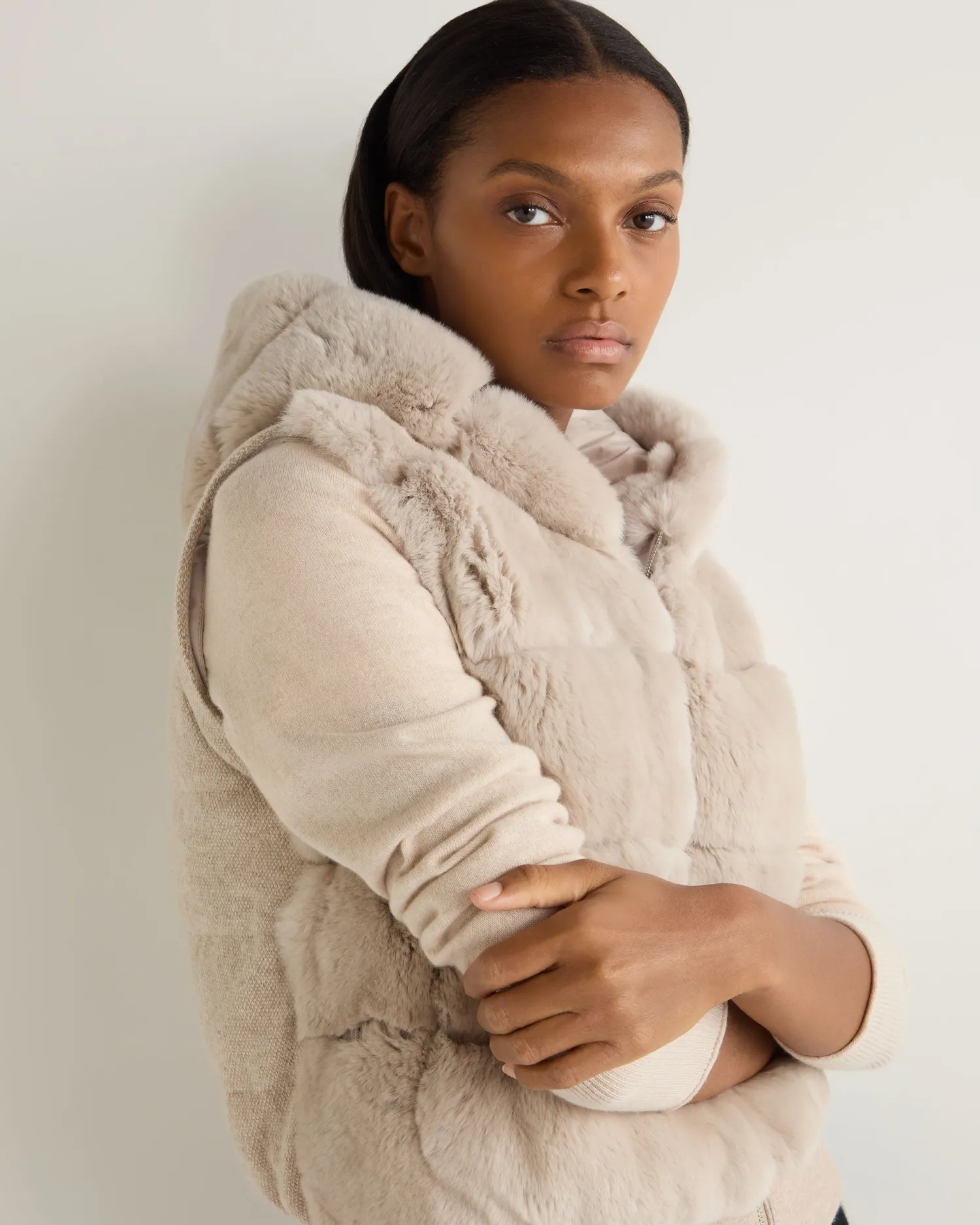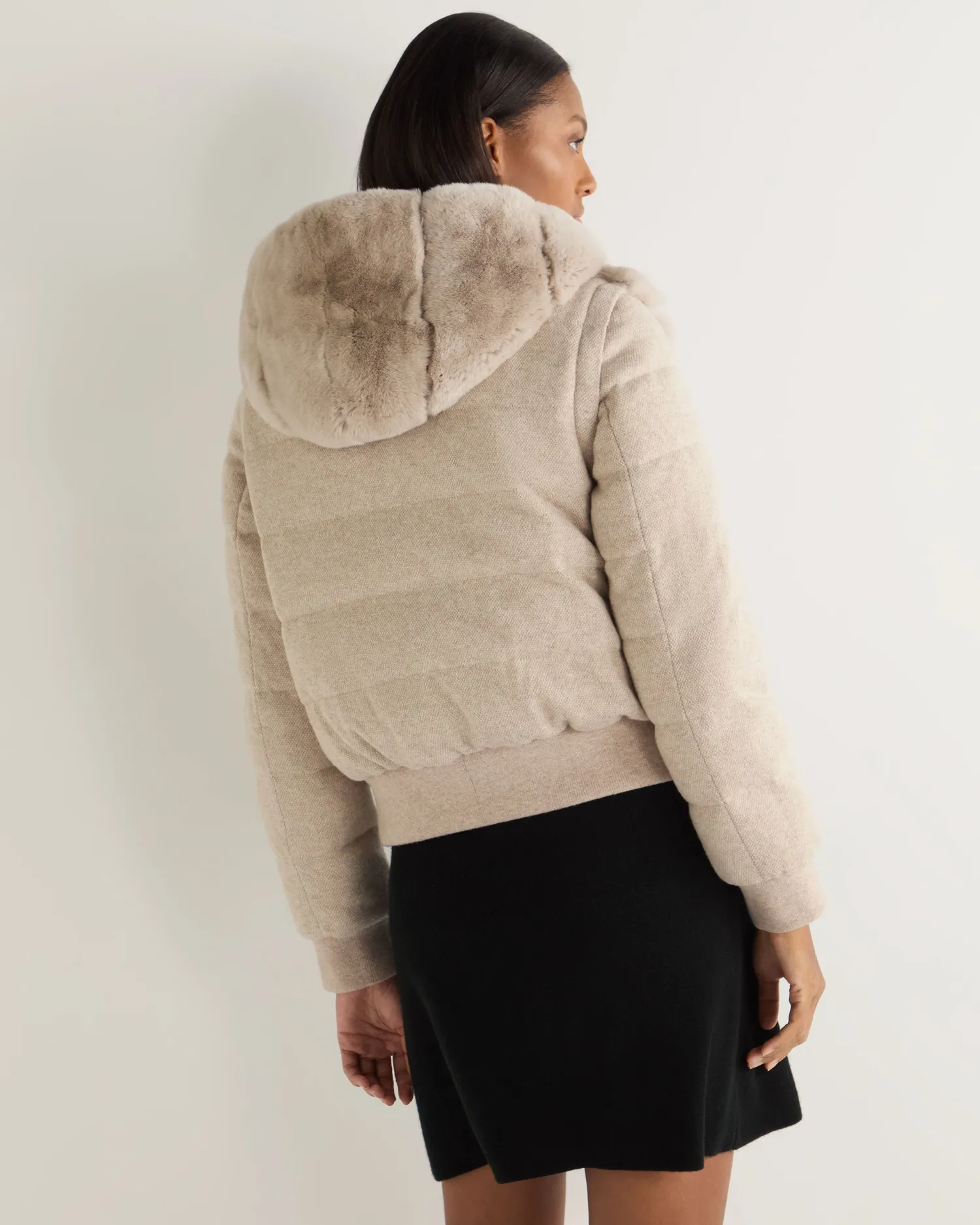 Step into a world where sophistication meets warmth with the Eva Birdseye fur hooded jacket, a masterpiece by N.Peal.n Made from 90% wool, 10% organic Mongolian cashmere and rex fur Luxuriously soft and comfortable, yet still so stylish Convenient zip to be either worn open or zipped up Gorgeous fur hood, ideal for the cold months Has detachable sleeves so can be worn as a jacket or gilet Reversible style with Rex fur one side and technical polyester on interior side Impeccably soft against the skin Model is wearing size Small Care: Dry Clean Only