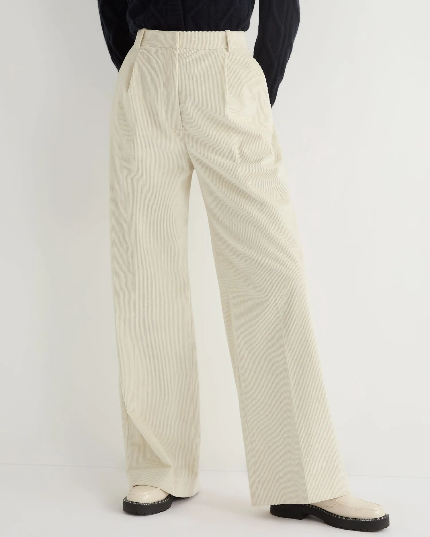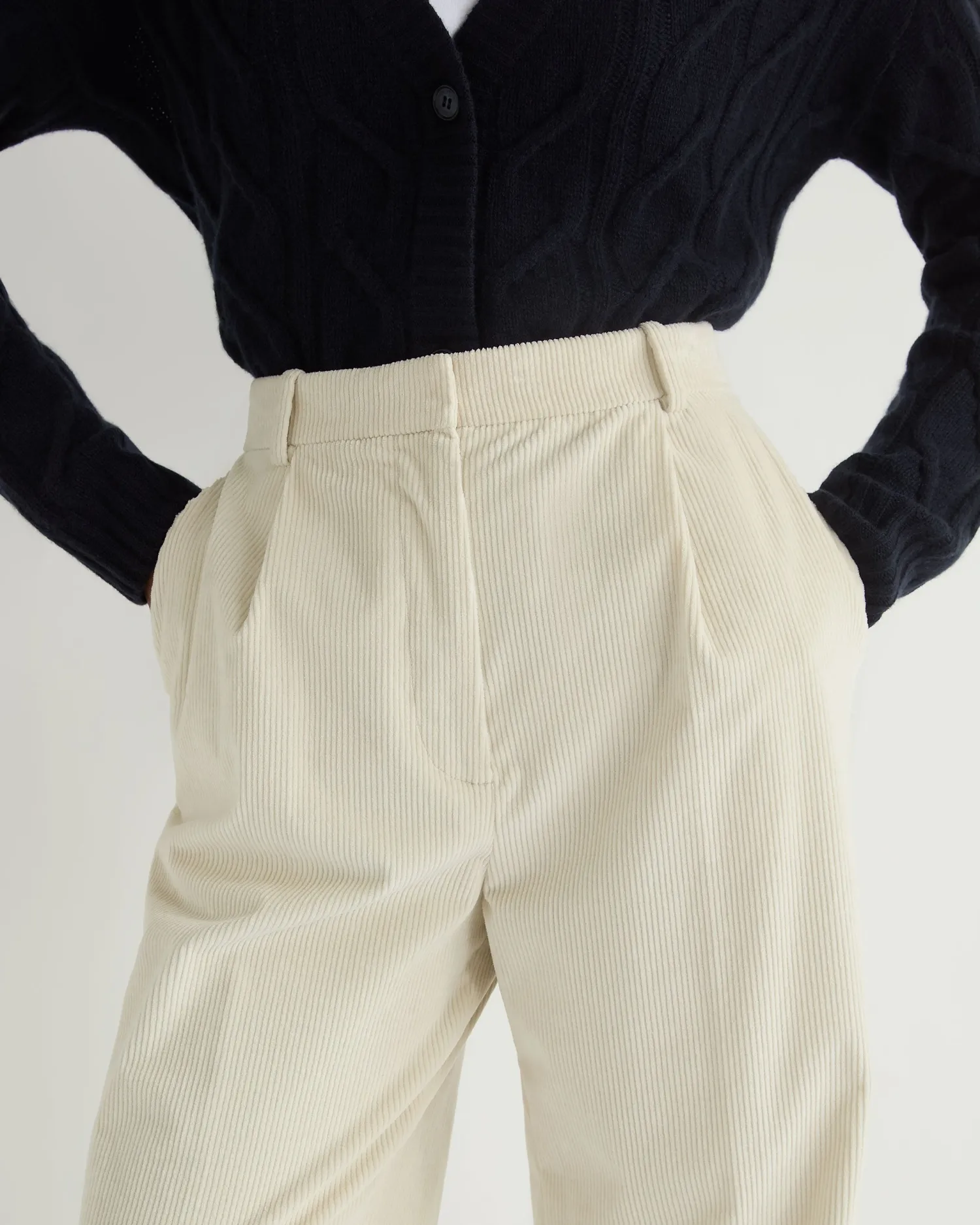 The N.Peal wide-leg pant is designed with a relaxed silhouette and strategically placed pleats that accentuate its high waistline. Crafted from a cotton cashmere cord produced by a leading Italian mill; the cashmere provides fluidity to the garment while the cotton provides softness. Made from 91% cotton, 7% cashmere and 2% elastane – Wide leg style, comfortable and loose fitting style – Hidden hook and zipper closure – Welt pockets with back flap pockets – Soft corduroy material – Model is wearing size Small – Care: Dry Clean Only