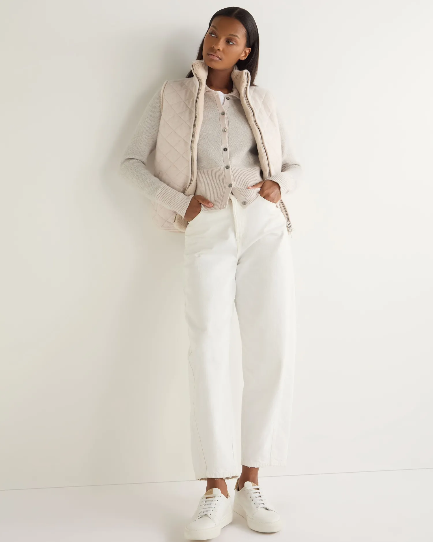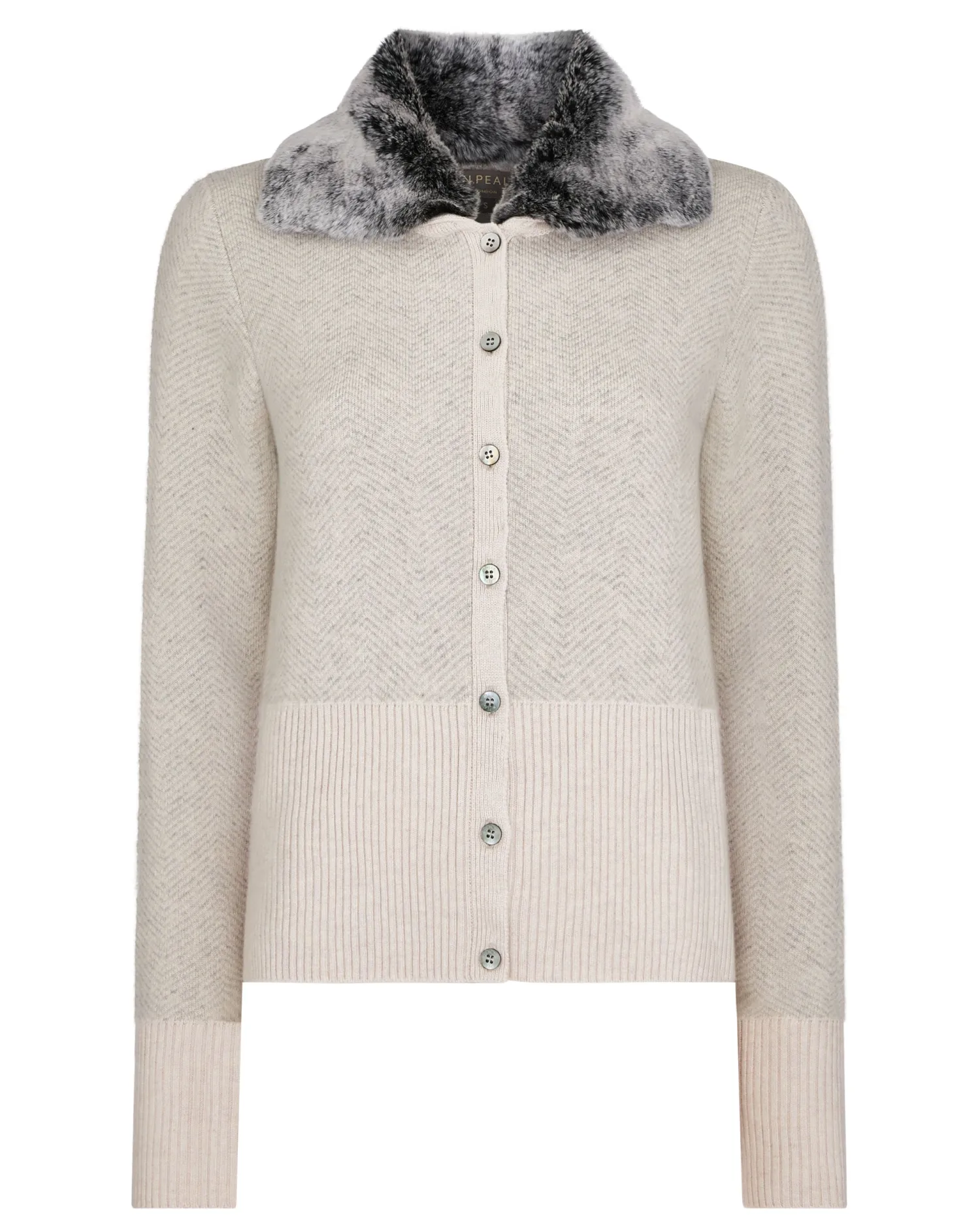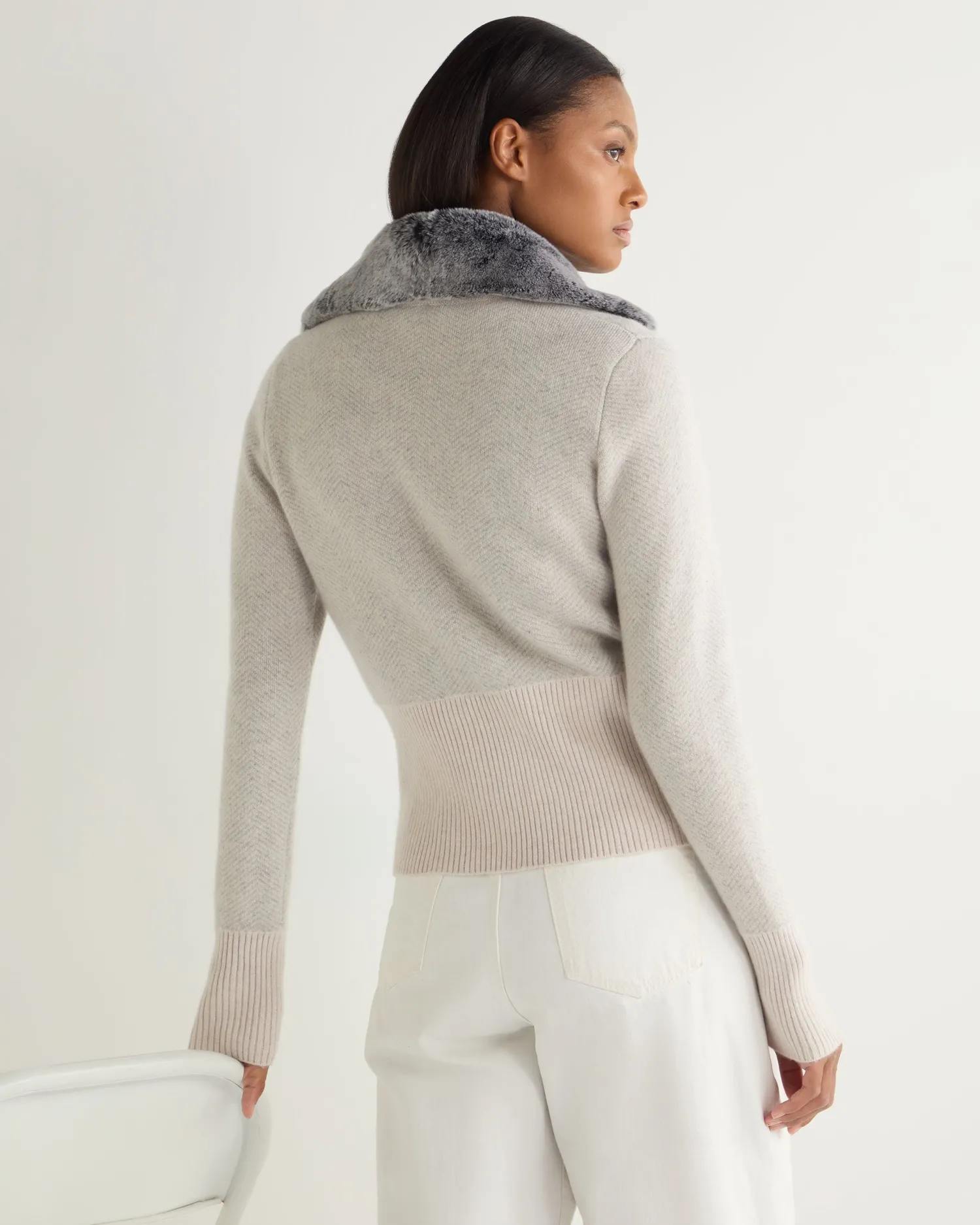 This style was so popular last winter that we have brought it back in a new colourway! Made from 100% Mongolian cashmere with a detachable white tipped rex fur trim – Delightful herringbone pattern in luxurious frost white and fumo grey- Matching deep ribbed cuffs and hem – Elegant design with luxe appeal – Fastens with elegant buttons, can be worn alone or as a layering piece – 1ply – Model is wearing size Small – Care: Dry Clean Only