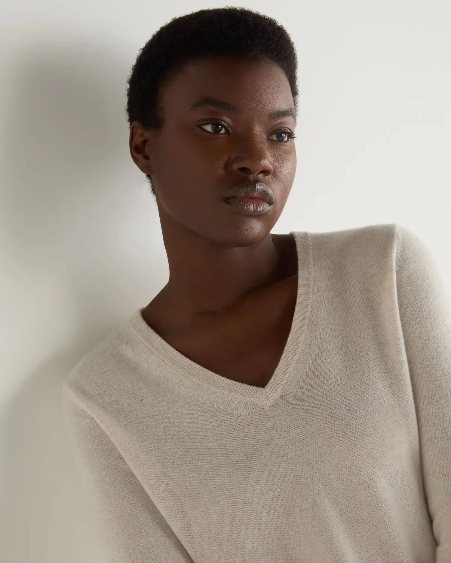 The perfect cashmere V neck sweater, in beautiful colours. Made from 100% Mongolian organic cashmere – Elegant v neck shape – Matching ribbed cuffs and hem – Superbly soft to touch – Cut beautifully to flatter the figure – Great selection of colour options – 1ply – Model is wearing size Small – Care: Hand Wash Organic cashmere: organic dyes and detergents, free from fertilizer and pesticides, find out more here