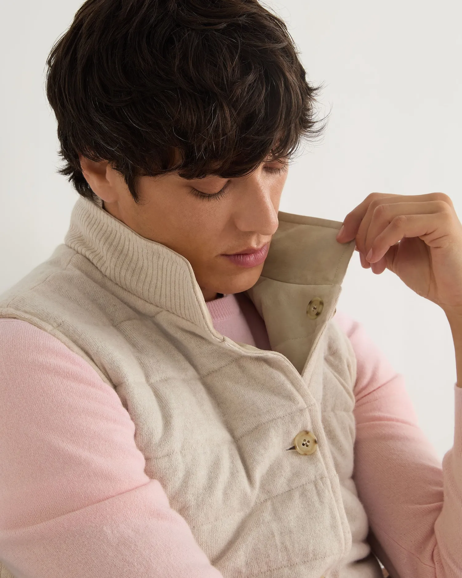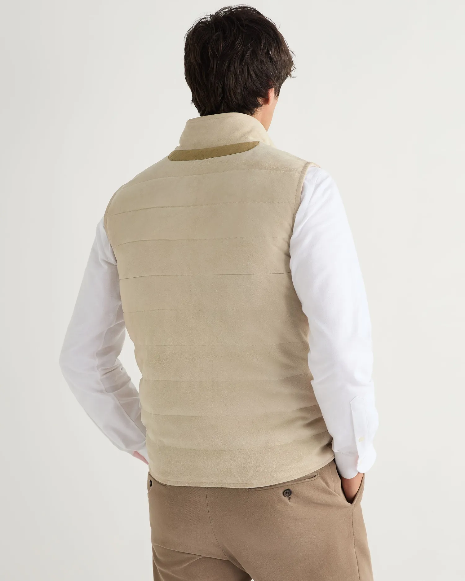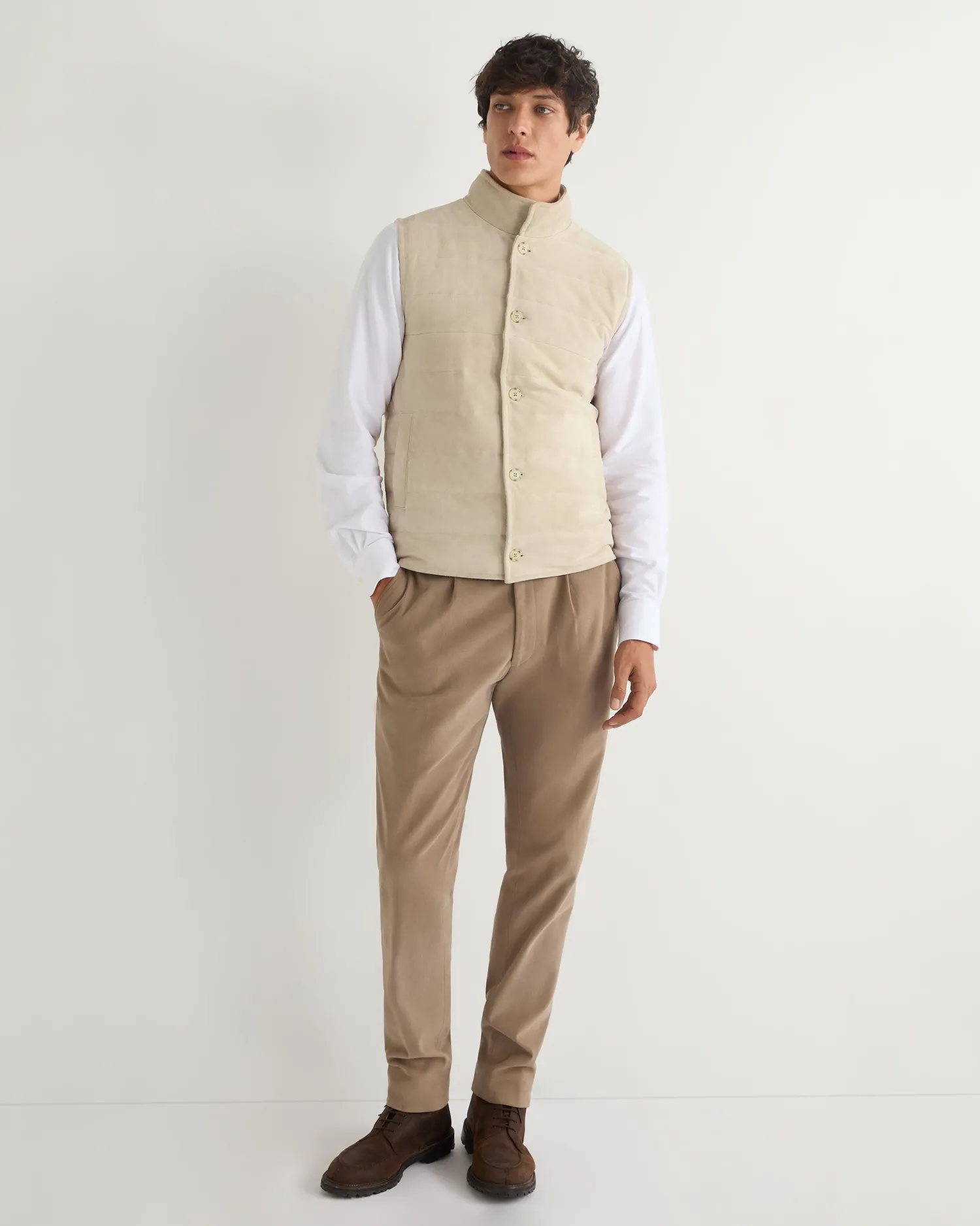This luxurious gilet is crafted from the fine, velvety texture of suede for a sophisticated layering style. The exterior is designed with clean channel stitching and the interior is crafted in our refined organic cashmere. The inner membrane of light cotton padding ensures ultimate comfort. Reversible style, one side 100% suede and the other side 100% cashmere- Luxuriously soft gilet – Horizontal stitch design – Five smart buttons down the centre – Comfortable and stylish fit – Practical subtle pockets – Versatile piece, effortlessly works casually or more formal – Perfect for wearing with a T-shirt or layering up in colder weather – 1Ply- Model is wearing size Medium – Dry Clean Onlyn
