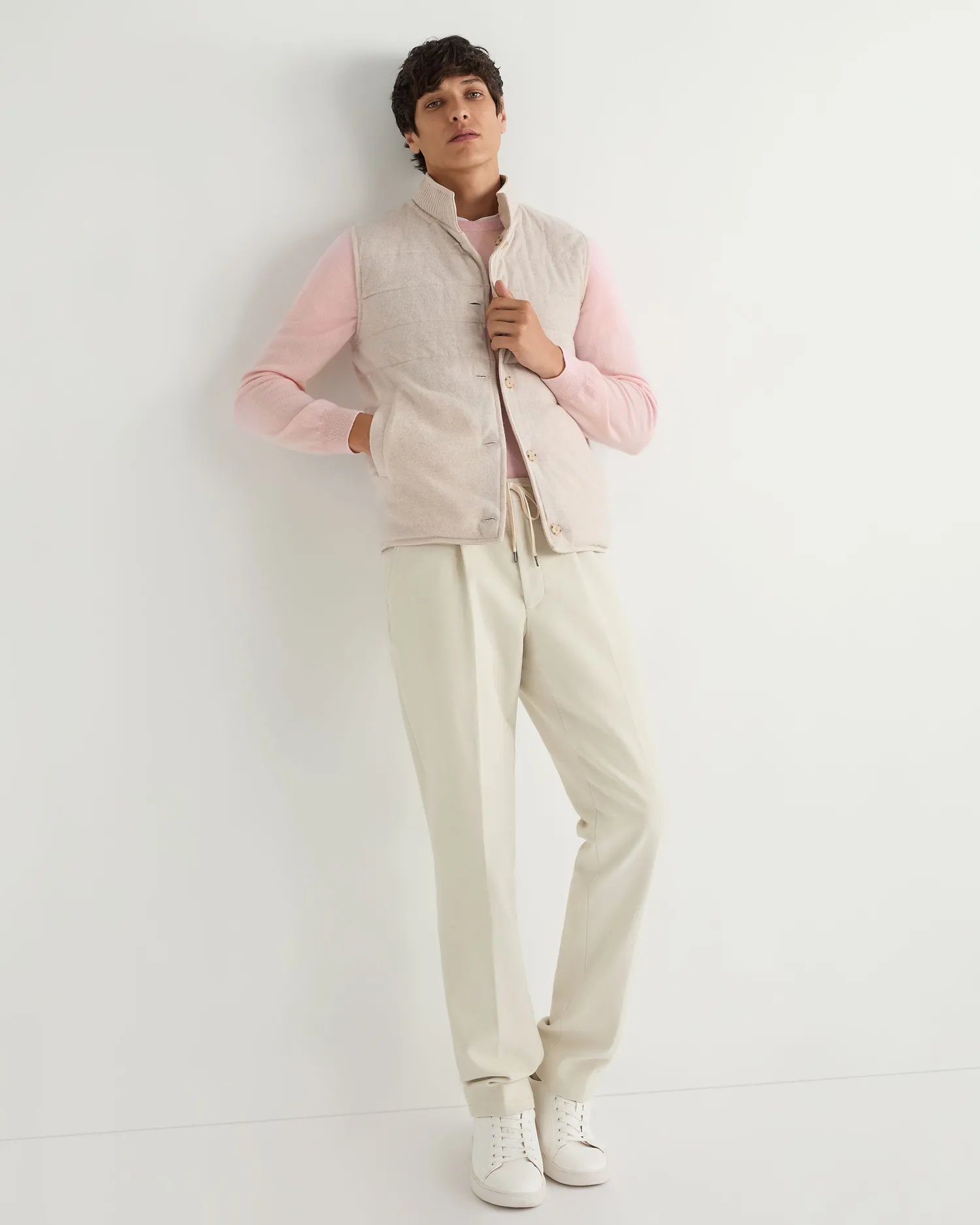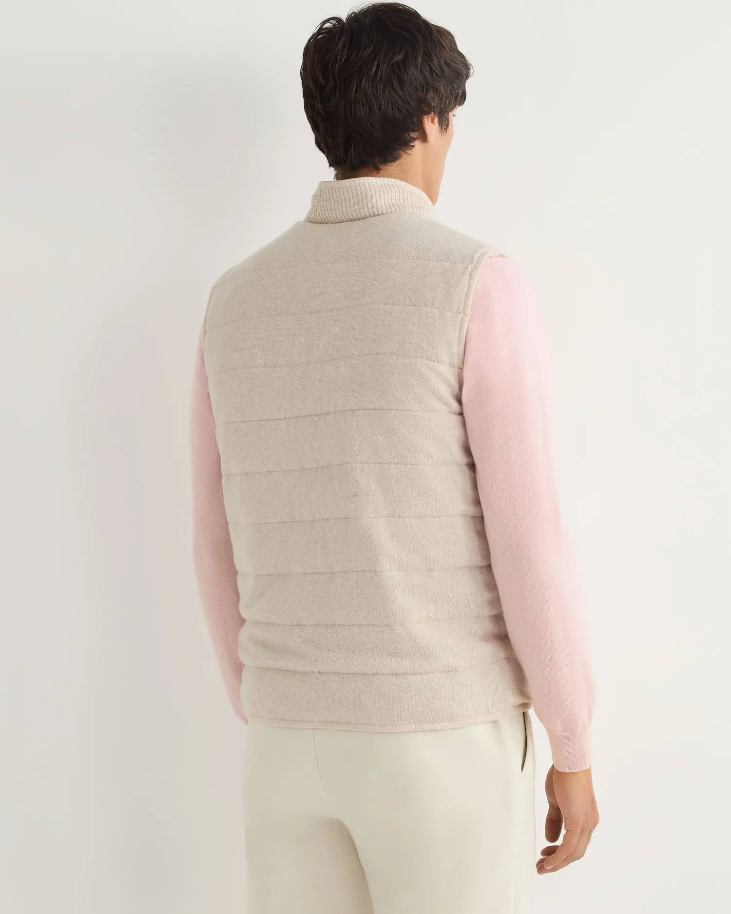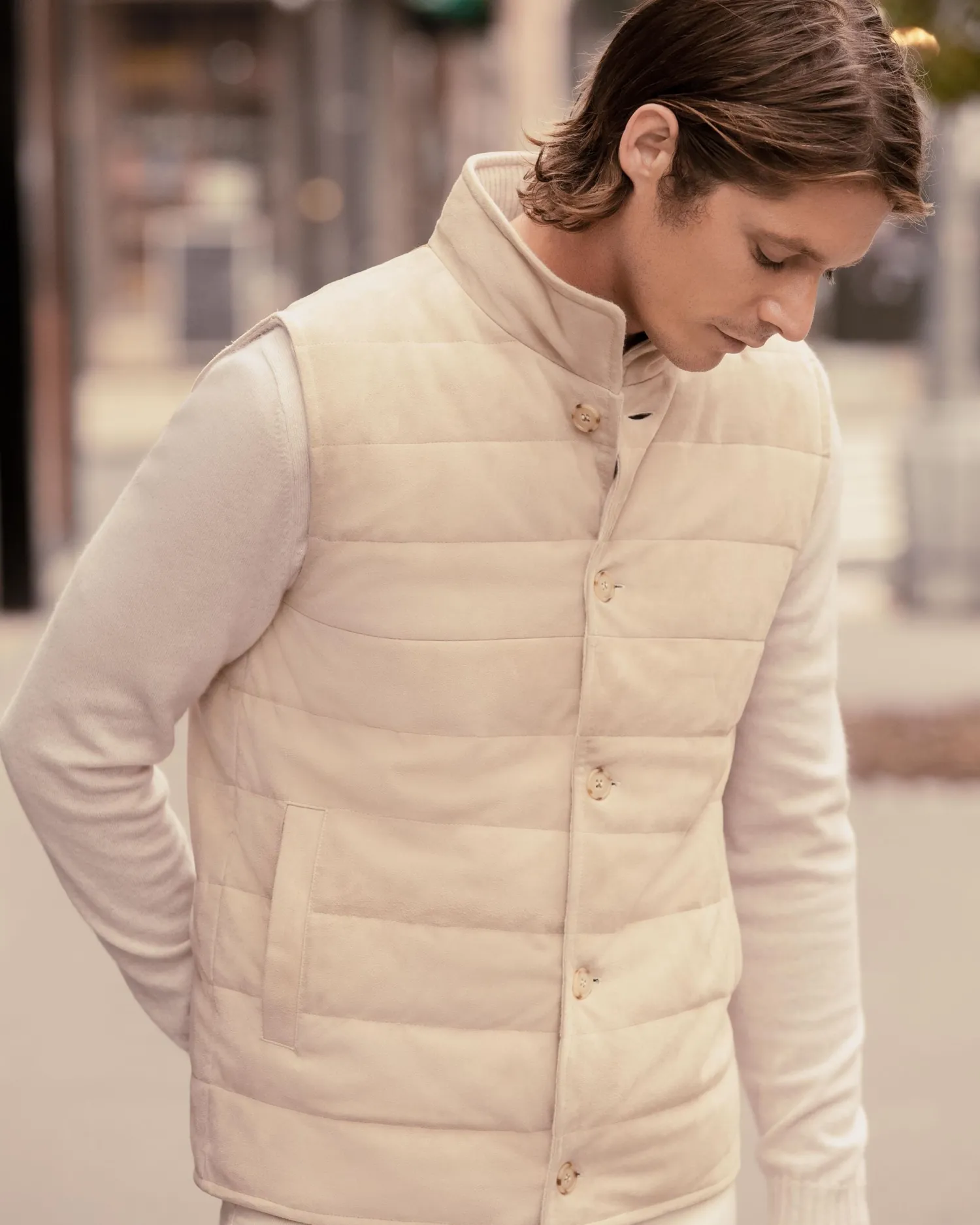 This luxurious gilet is crafted from the fine, velvety texture of suede for a sophisticated layering style. The exterior is designed with clean channel stitching and the interior is crafted in our refined organic cashmere. The inner membrane of light cotton padding ensures ultimate comfort. Reversible style, one side 100% suede and the other side 100% cashmere- Luxuriously soft gilet – Horizontal stitch design – Five smart buttons down the centre – Comfortable and stylish fit – Practical subtle pockets – Versatile piece, effortlessly works casually or more formal – Perfect for wearing with a T-shirt or layering up in colder weather – 1Ply- Model is wearing size Medium – Dry Clean Onlyn